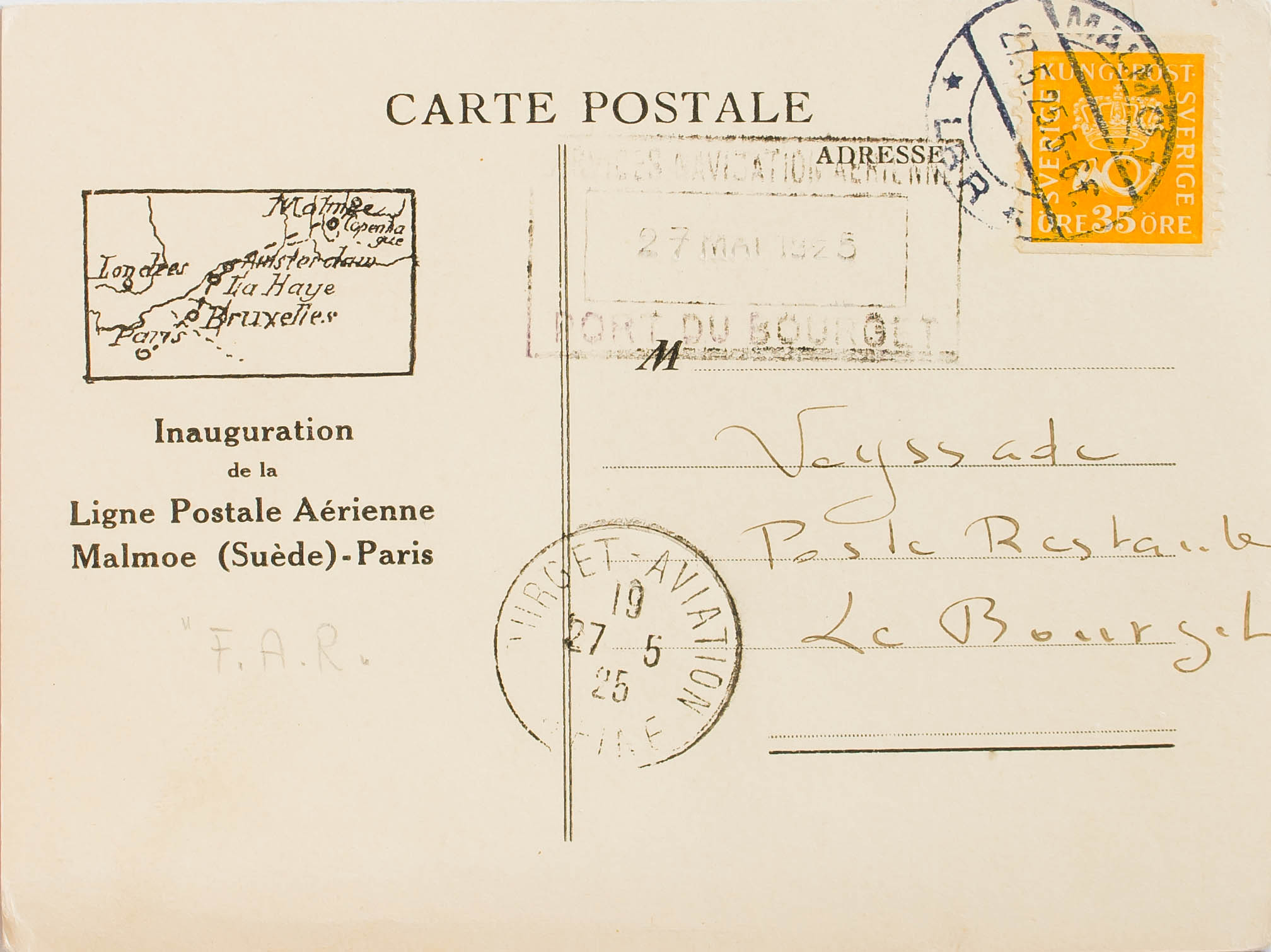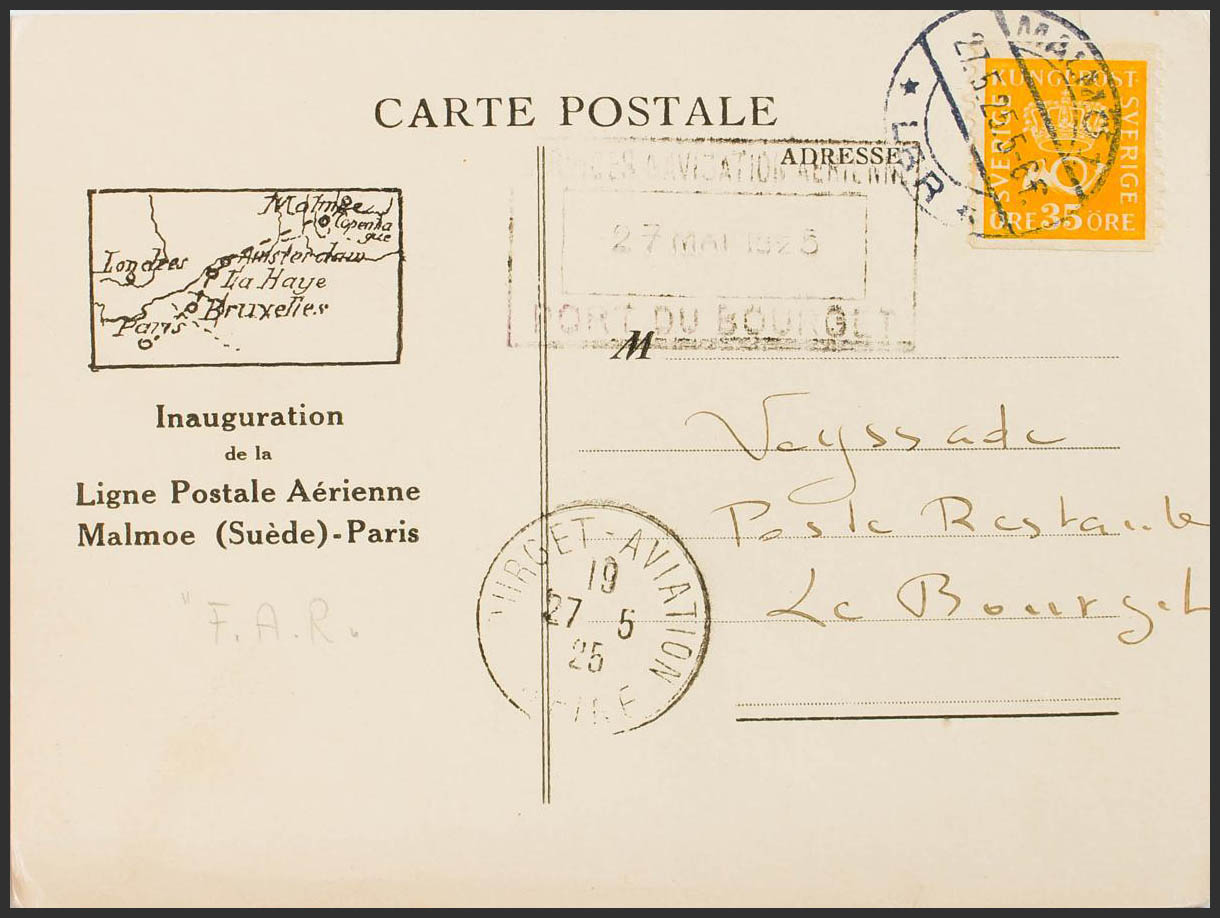 Yvert 137. 1925. 35 ore amarillo. Tarjeta Postal de la F.A.R. de MALMO a LE BORGET (FRANCIA). En el frente marca SERVICES NAVIGATION AERIENNE / PORT DU BOURGET y llegada. MAGNIFICA.