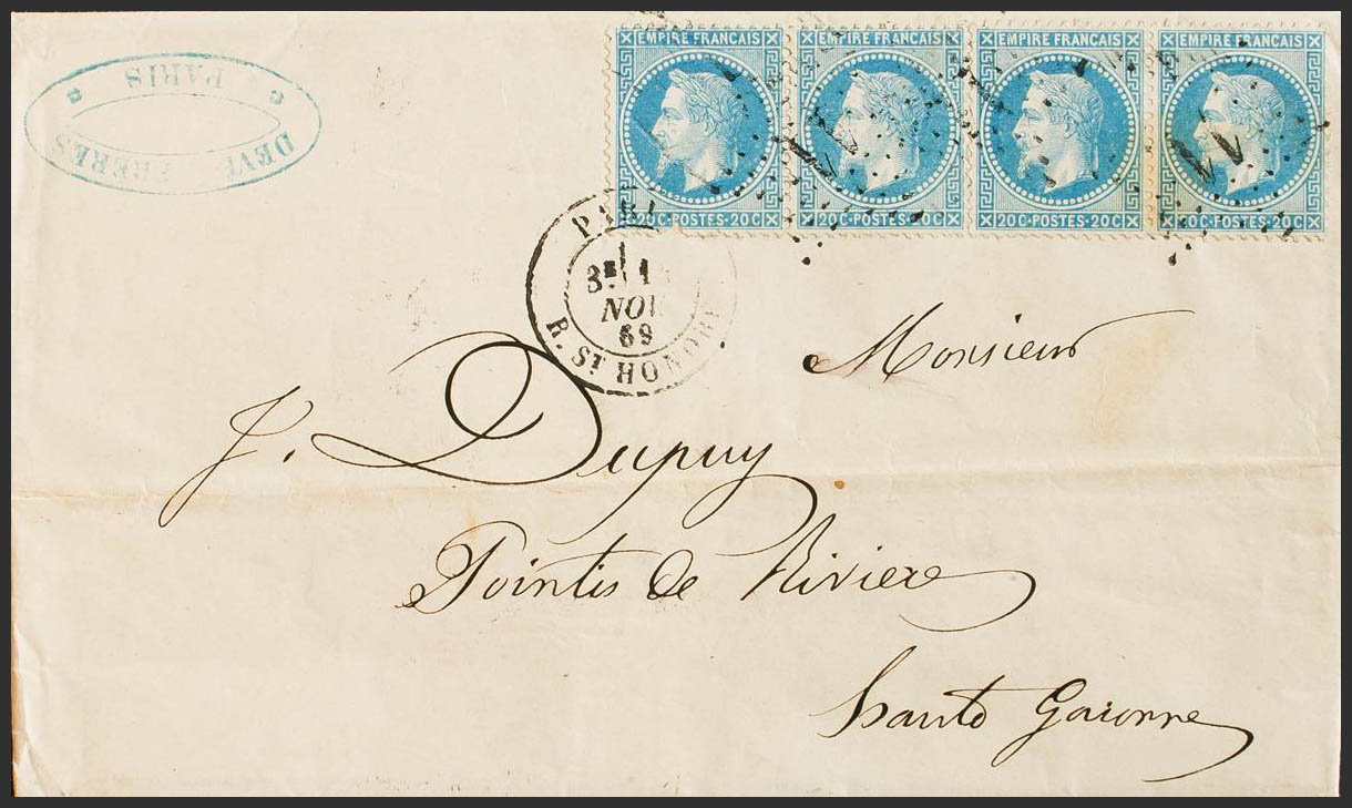Yvert 29B(4). 1869. 20 cts azul, tira de cuatro (un sello defecto sin importancia). PARIS a POINTIS DE RIVIERE. Matasello ESTRELLA DE PUNTOS Nº11. BONITA.