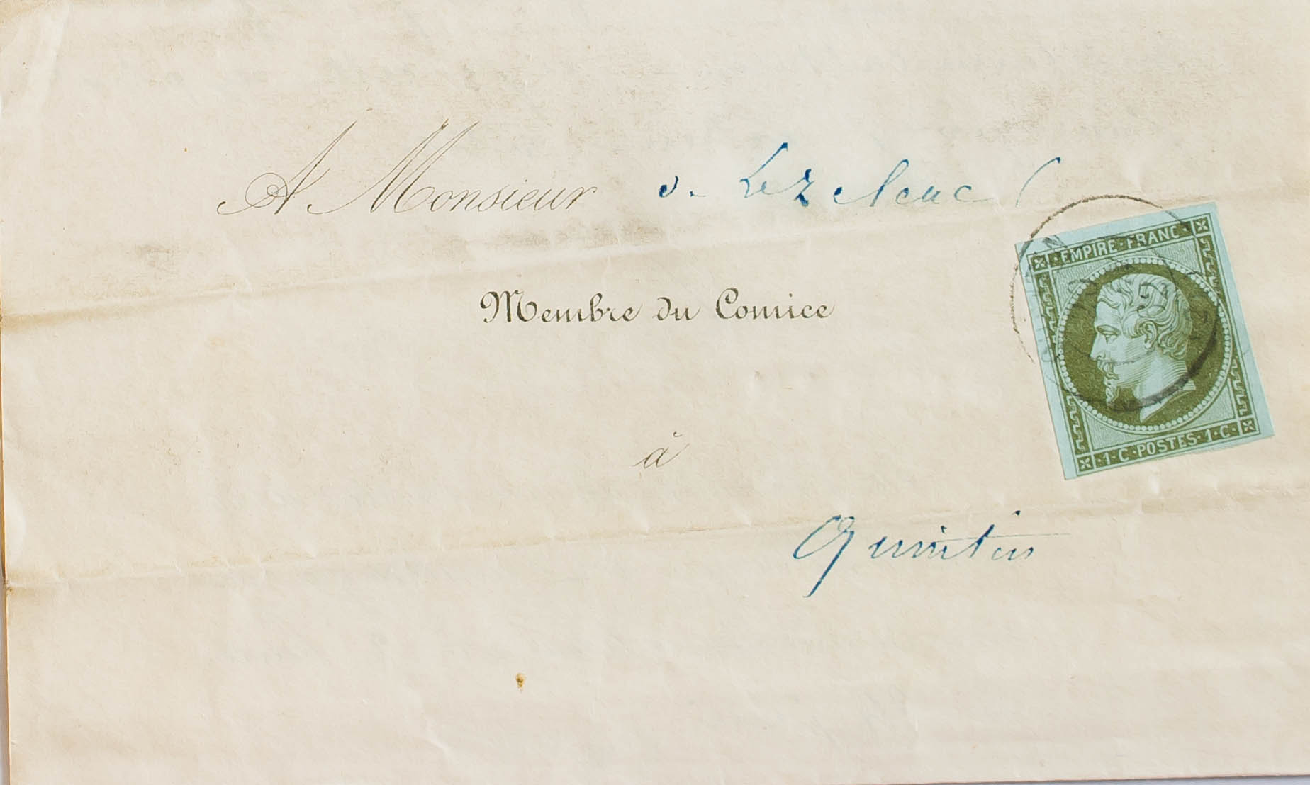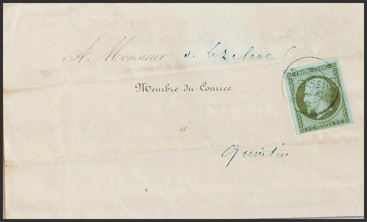 Yvert 11. 1862. 1 cts oliva (margen inferior justo). Impreso Correo Interior de QUINTIN. Matasello QUINTIN / (21). BONITA.