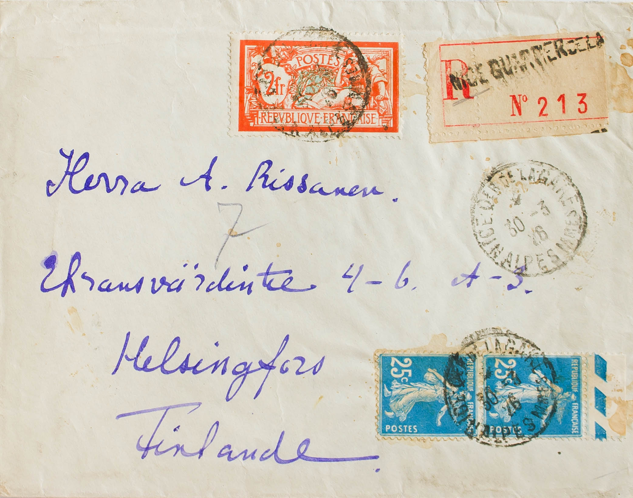Yvert 140(2), 145. 1926. 25 cts azul, dos sellos y 2 fr naranja. Certificado de NIZA a HELSINKI (FINLANDIA). Matasello NICE QER DE LA GARE / ALPES MRES. MAGNIFICA.