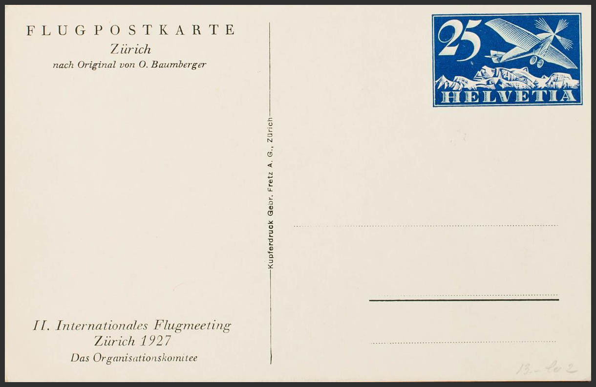 (★)1927. 25 cts azul sobre Tarjeta Entero Postal INTERNATIONALES FLUGMEETING ZURICH 1927. MAGNIFICA Y RARA.
