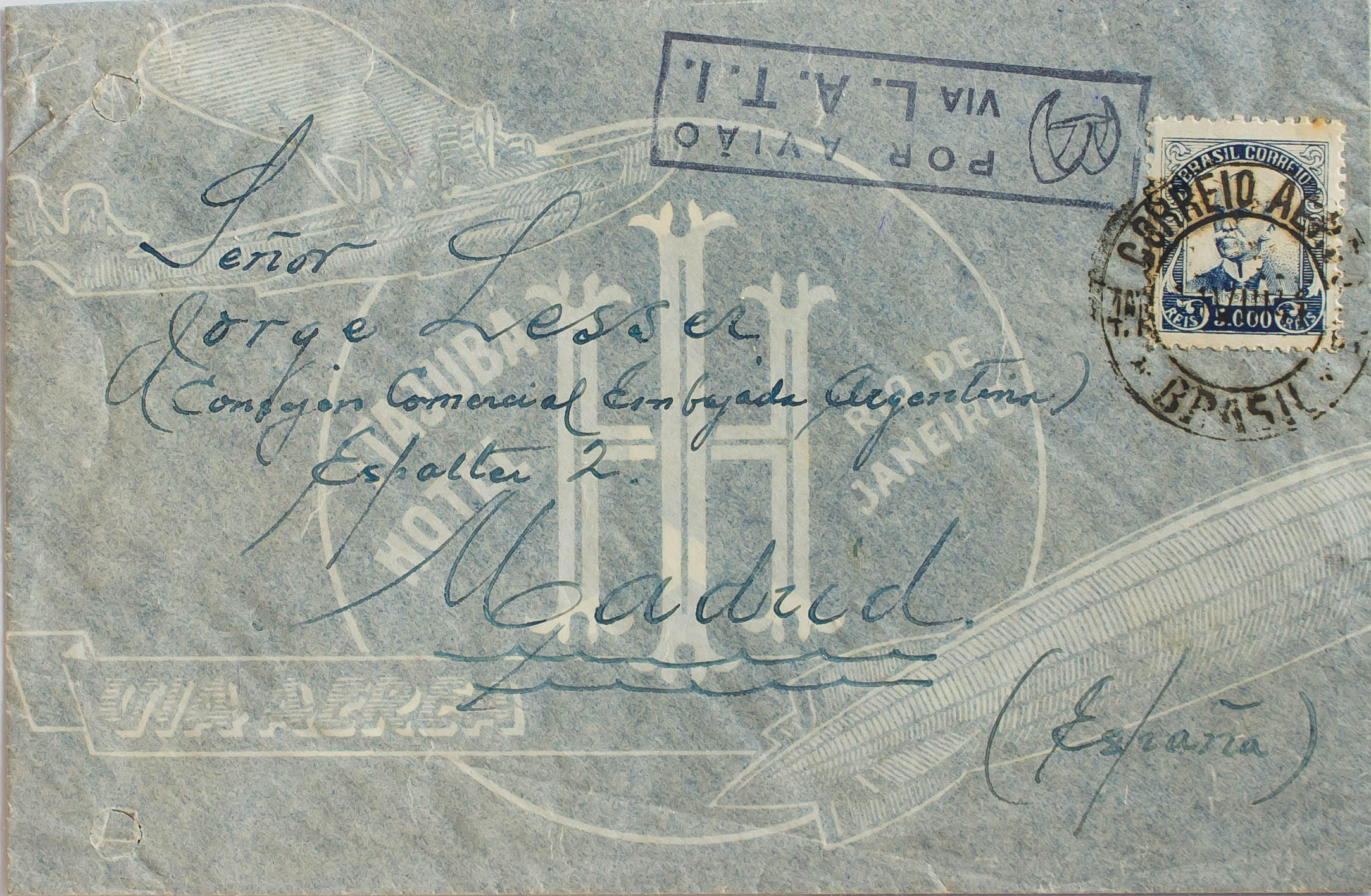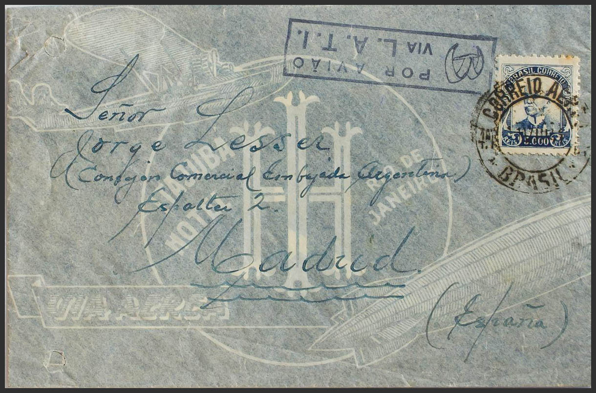 Yvert 209. 1941. 5000 reis azul. Correo Aéreo de RIO DE JANEIRO a MADRID. En el frente marca POR AVIAO / VIA L.A.T.I., al dorso llegada. MAGNIFICA.