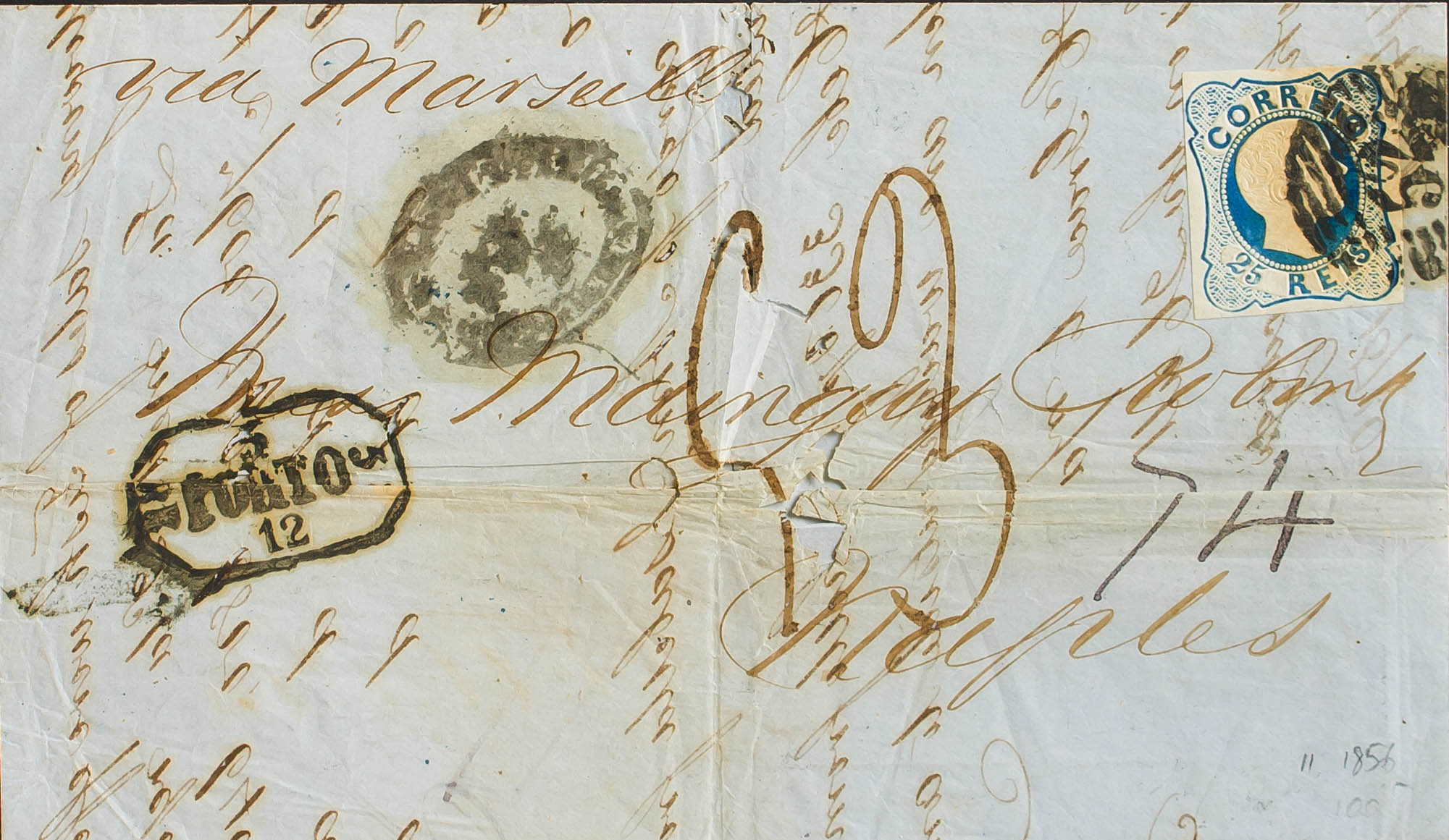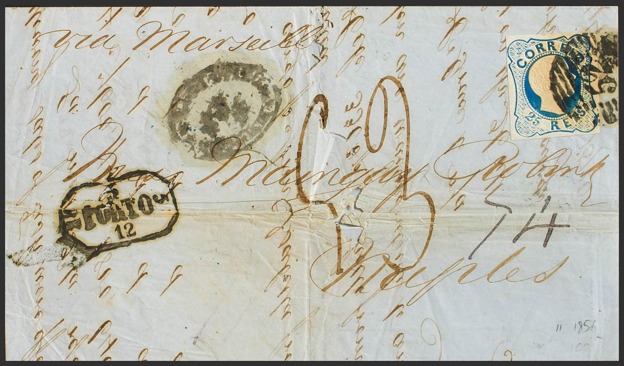 Yvert 11. 1856. 25 reis azul. OPORTO a NAPOLES (ligeramente erosionada en el frente). En el frente porteos "53" y "54" manuscritos. MAGNIFICA Y RARA, CIRCULADA CON TARIFA PARA TERRITORIO PORTUGUES AL NO EXISTIR CONVENIO.