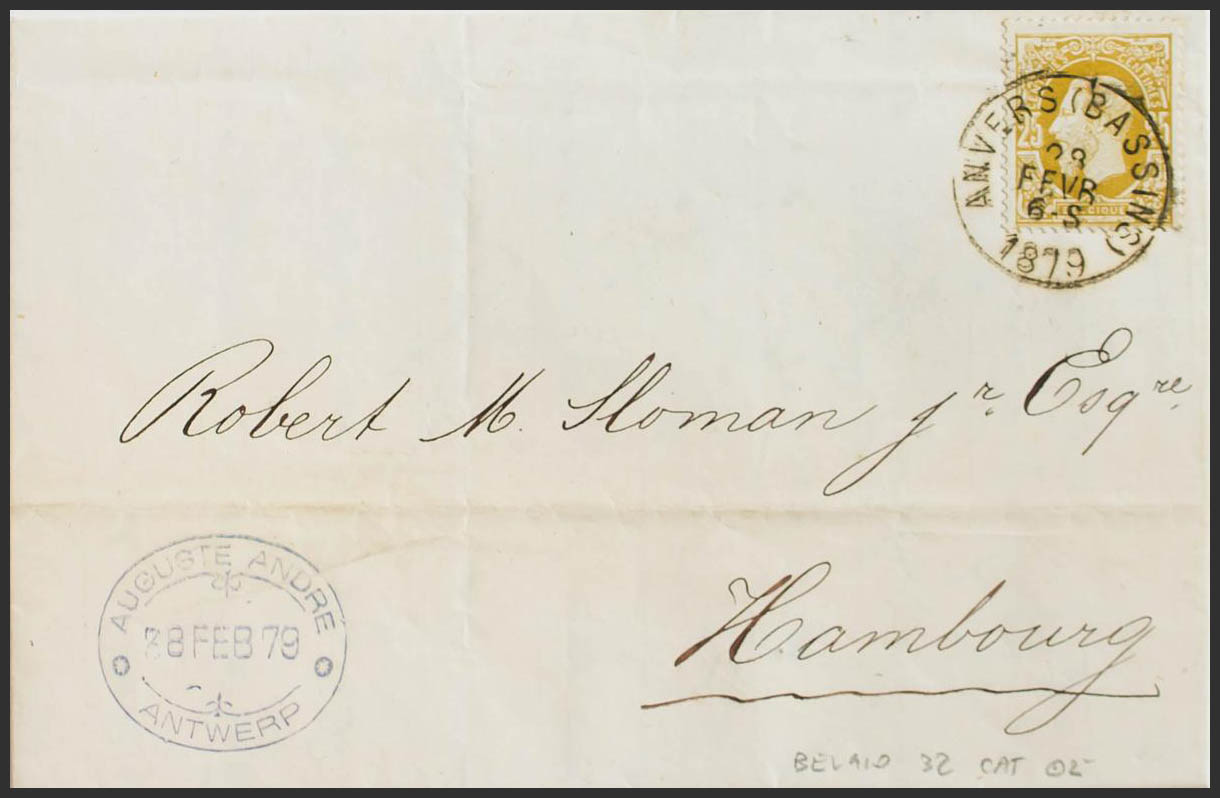 Yvert 32. 1879. 25 cts oliva. AMBERES a HAMBURGO. MAGNIFICA.