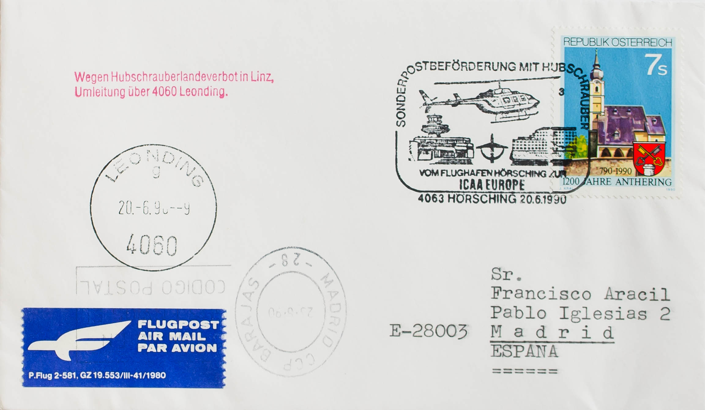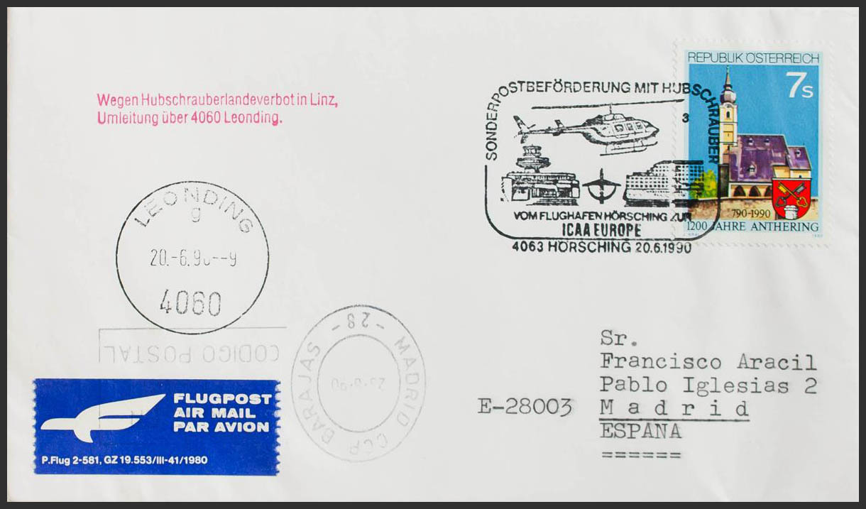 Yvert 1814. 1990. 7 s multicolor. Sobre del Primer Día de LEONDING (AUSTRIA) a MADRID. Matasello especial SUNDERPOST BEFÖRDERUNG MIT HUBSCHRAUBER (transporte especial por helicóptero) y en el frente llegada. MAGNIFICA.