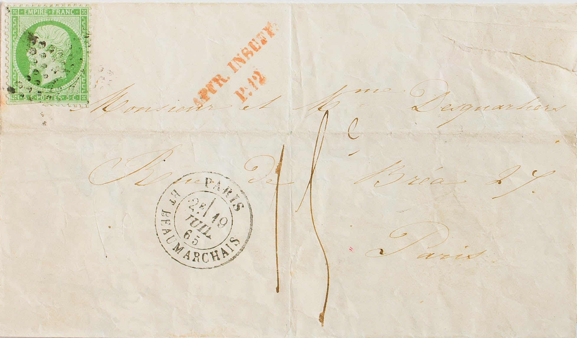 Yvert 20. 1865. 5 cts verde. Correo Interior de PARIS. En el frente marca AFFR. INSUFF. / P.12, en rojo y tasa manuscrita. MAGNIFICA.