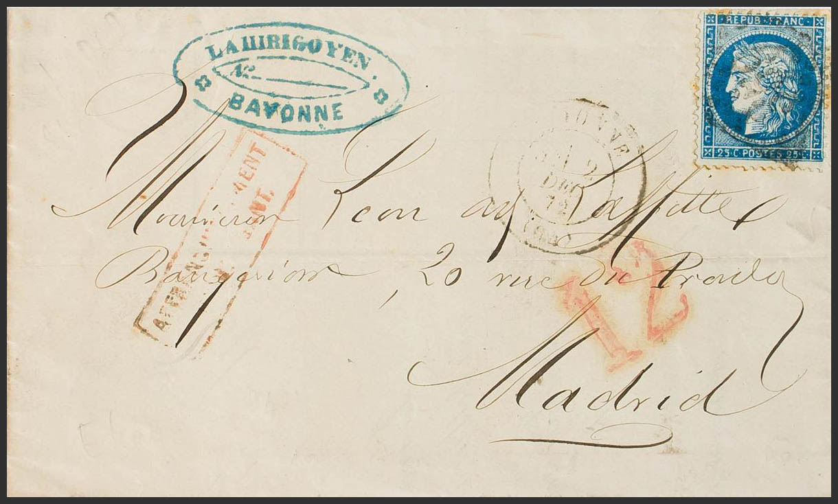 Yvert 60A. 1872. 25 cts azul. BAYONA a MADRID. En el frente marca AFFRANCHISEMENT / INSUFFISANT y porteo "12", ambos en rojo. MAGNIFICA.