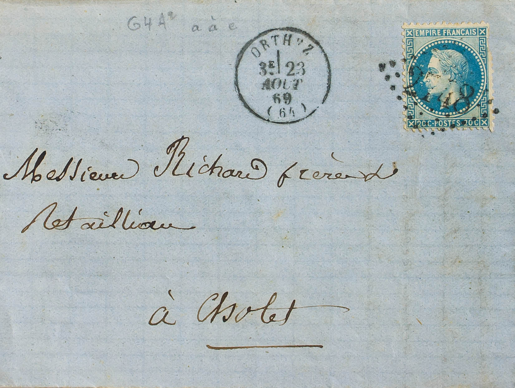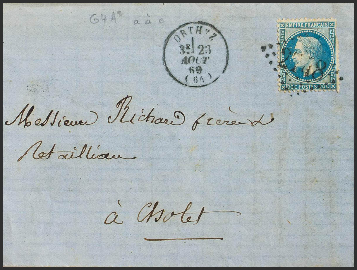 Yvert 29Bc. 1869. 20 cts azul (defectito en margen derecho) variedad "ABEJAS" DELANTE DE LA EFIGIE. ORTHEZ a CHOLET. Matasello ROMBO DE CIFRAS GRNADES Nº2748. BONITO Y RARO SELLO SOBRE CARTA.