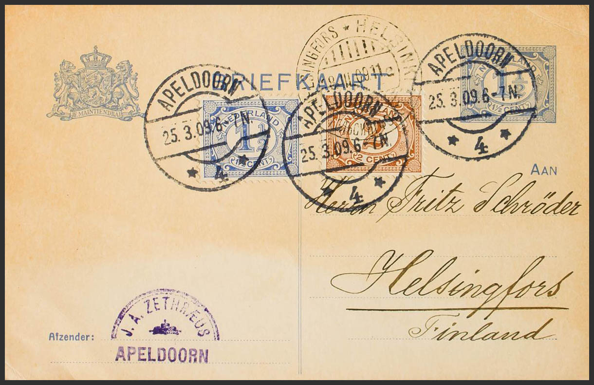 Yvert 67, 68. 1909. 1 ½ cts lila sobre Tarjeta Entero Postal de APELDOORN a HELSINKI (FINLANDIA), con franqueo complementario de 1 ½ cts y 2 cts. En el frente llegada. MAGNIFICA.