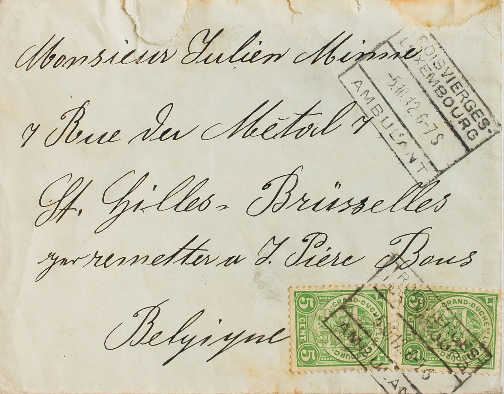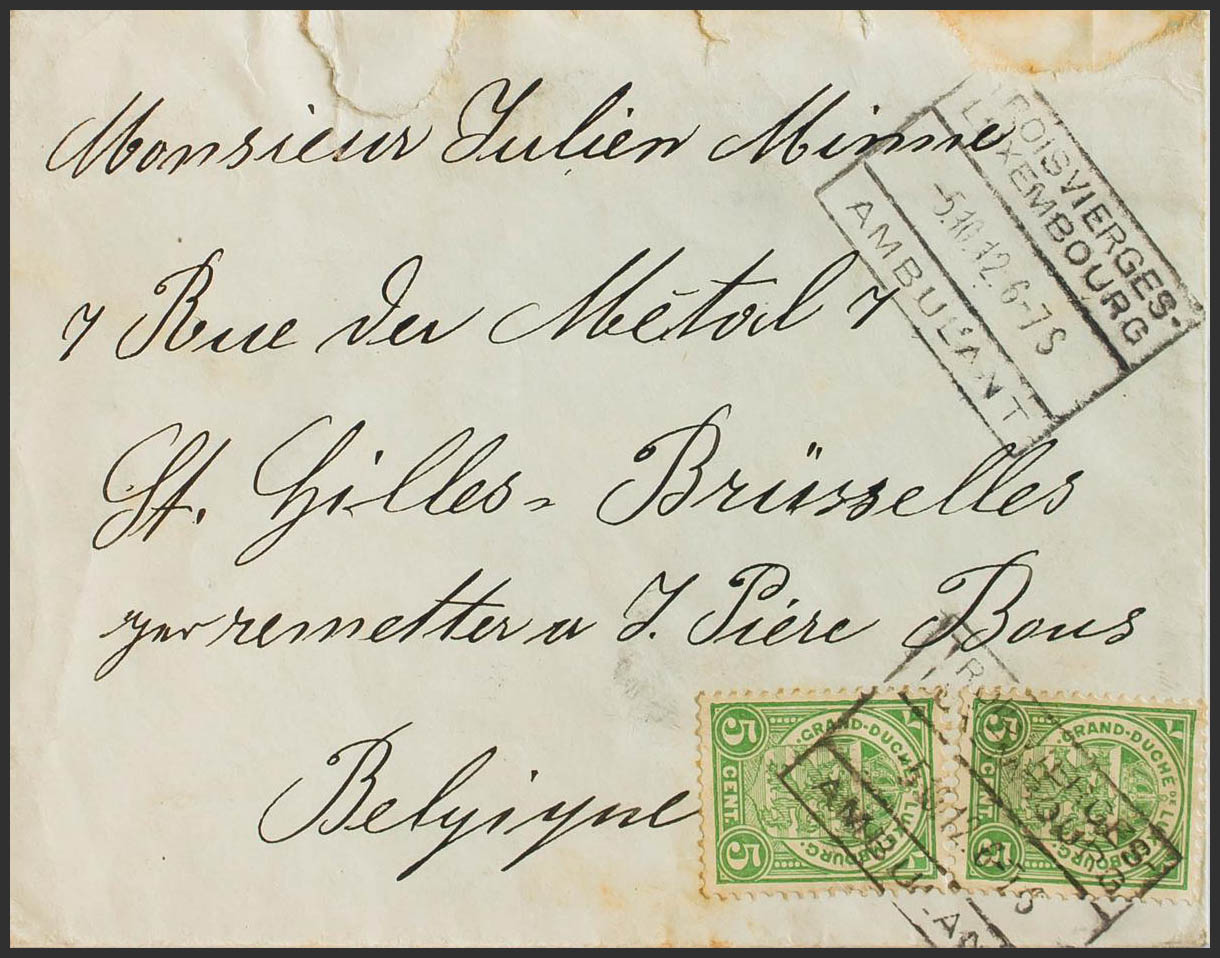 Yvert 92(2). 1912. 5 cts verde, dos sellos. TROIS VIERGES a BRUSELAS (BELGICA). Matasello TROIS VIERGES / LUXEMBOURG / AMBULANT, al dorso llegada. BONITA.