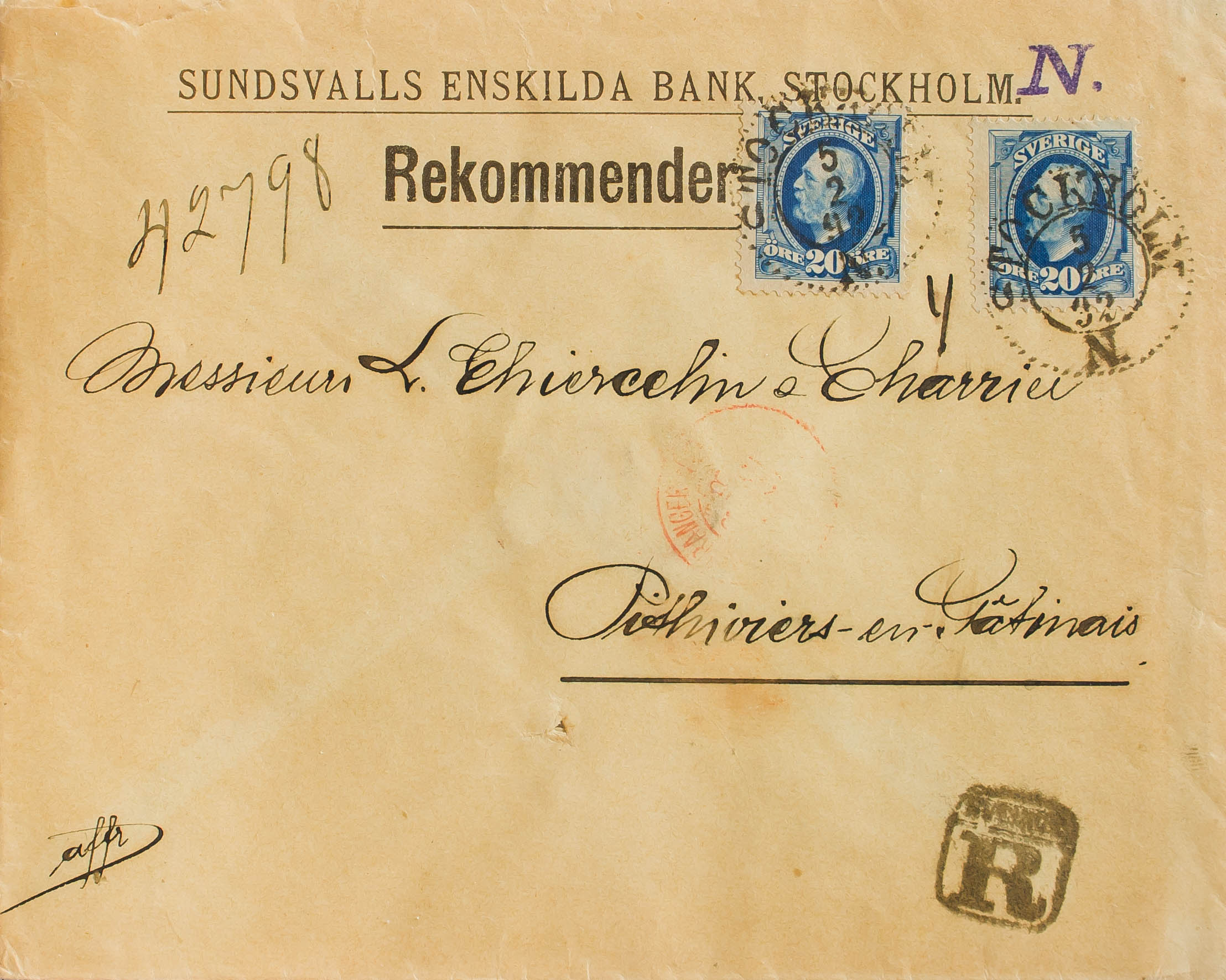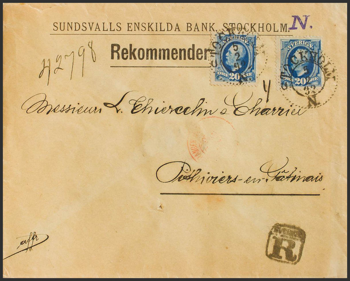 Yvert 45(2). 1892. 20 ore azul, dos sellos. Certificado de ESTOCOLMO a PITHIVIERS (FRANCIA). Al dorso llegada. MAGNIFICA.