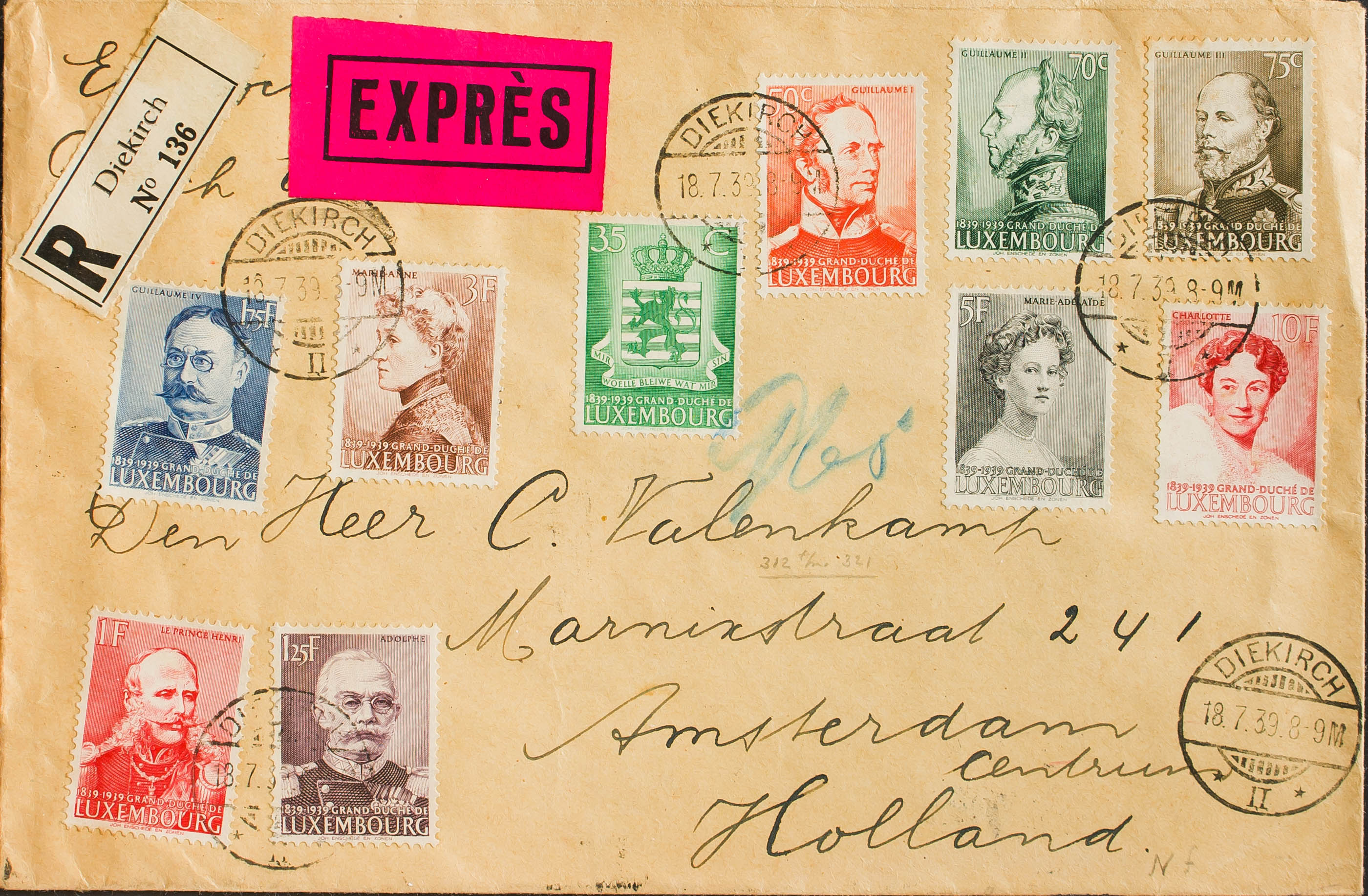 Yvert 312/21. 1939. Serie completa. Certificado de DIEKIRCH a AMSTERDAM (HOLANDA). Al dorso llegada. MAGNIFICA.