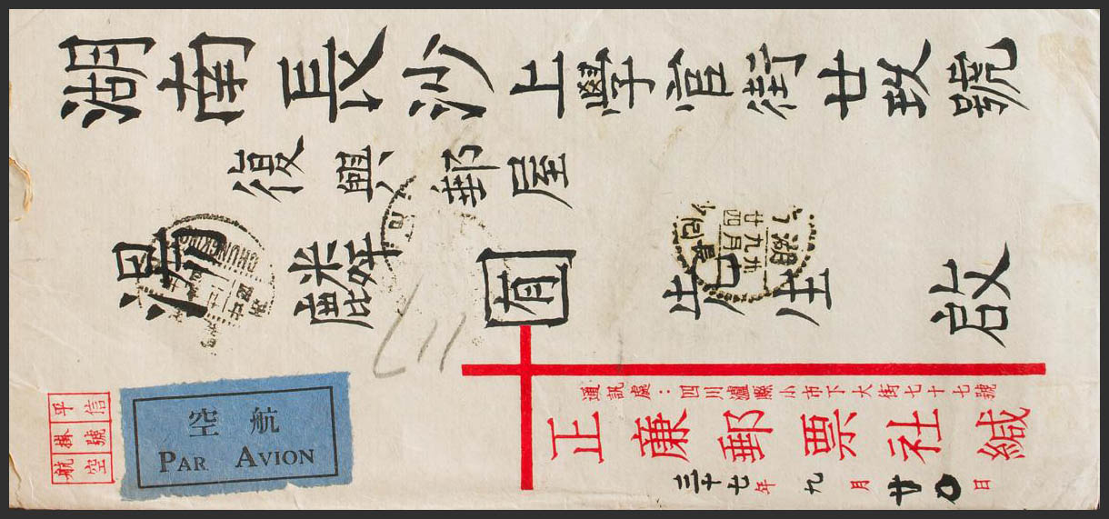 Yvert 587, Aéreo 38(9). (1948ca). 50000$ azul y 10000$ sobre 30 cts bermellón, al dorso. Correo Aéreo de CHONGKING a CHANGSA. MAGNIFICA.