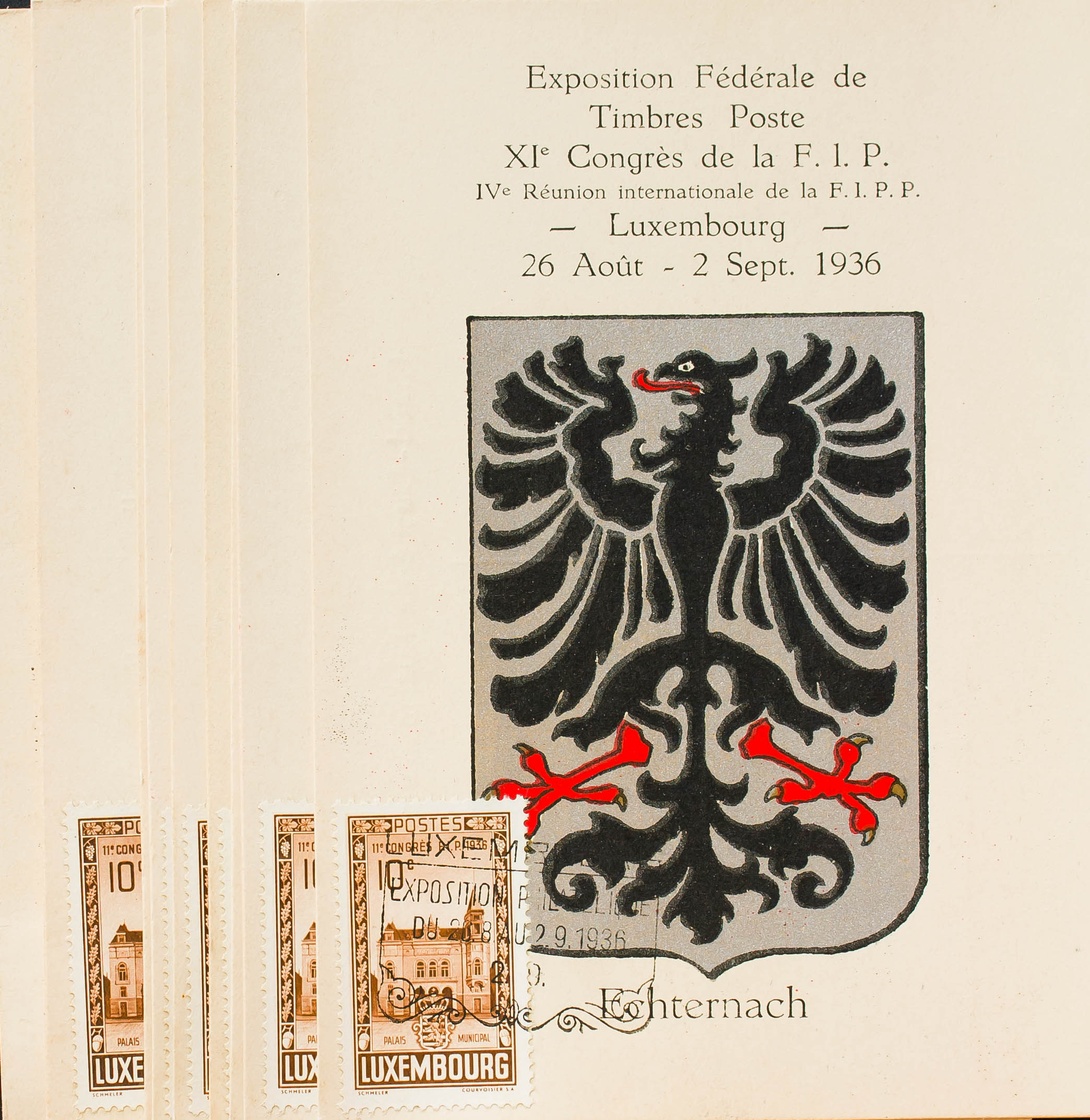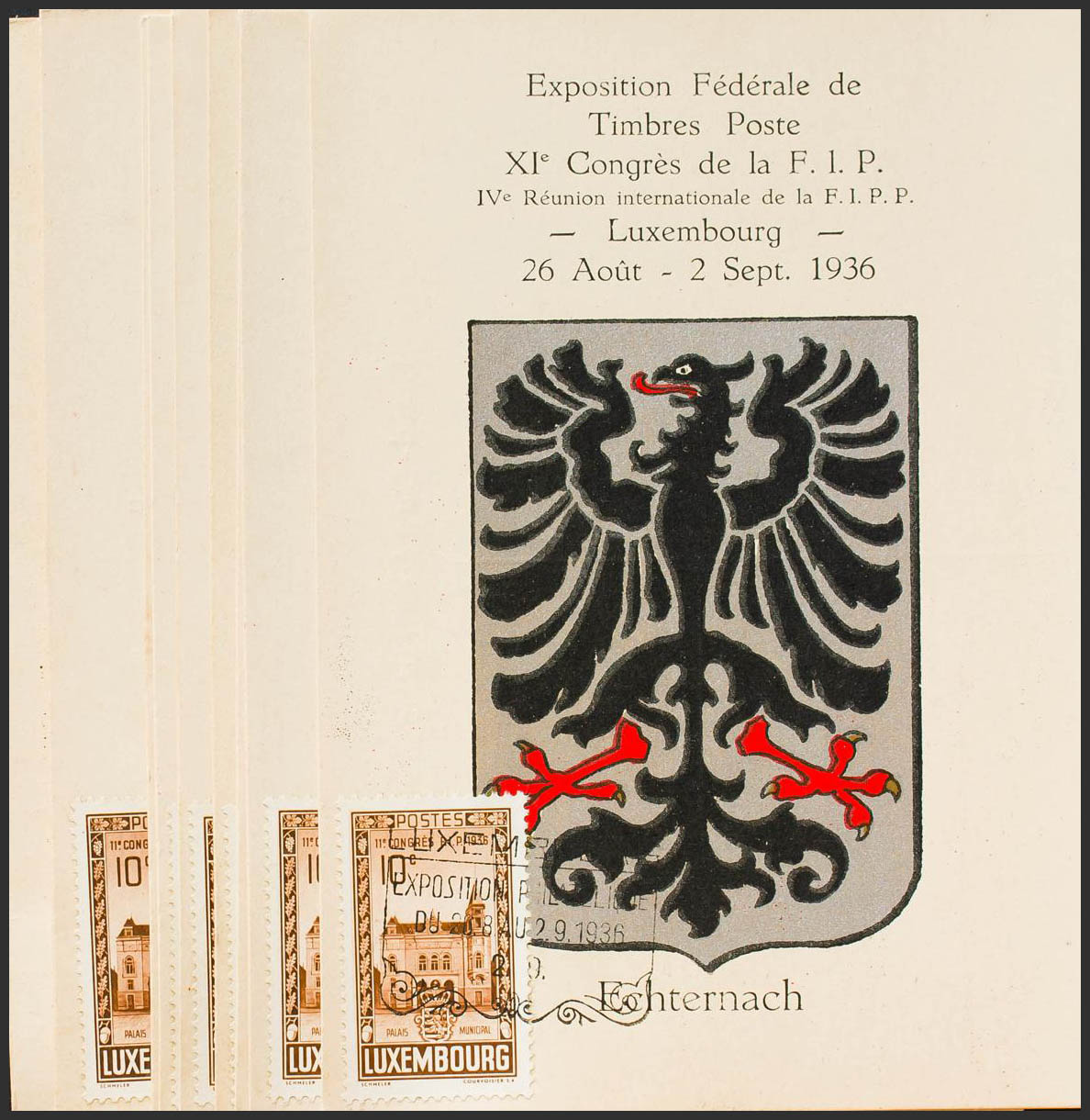 Yvert 282. 1936. Juego de nueve tarjetas postales de la EXPOSITION FEDERALE DE TIMBRES POSTE-XIº CONGRES DE LA FIP, con el sello de 10 cts castaño y 35 cts verde de 1936. MAGNIFICAS Y RARAS.