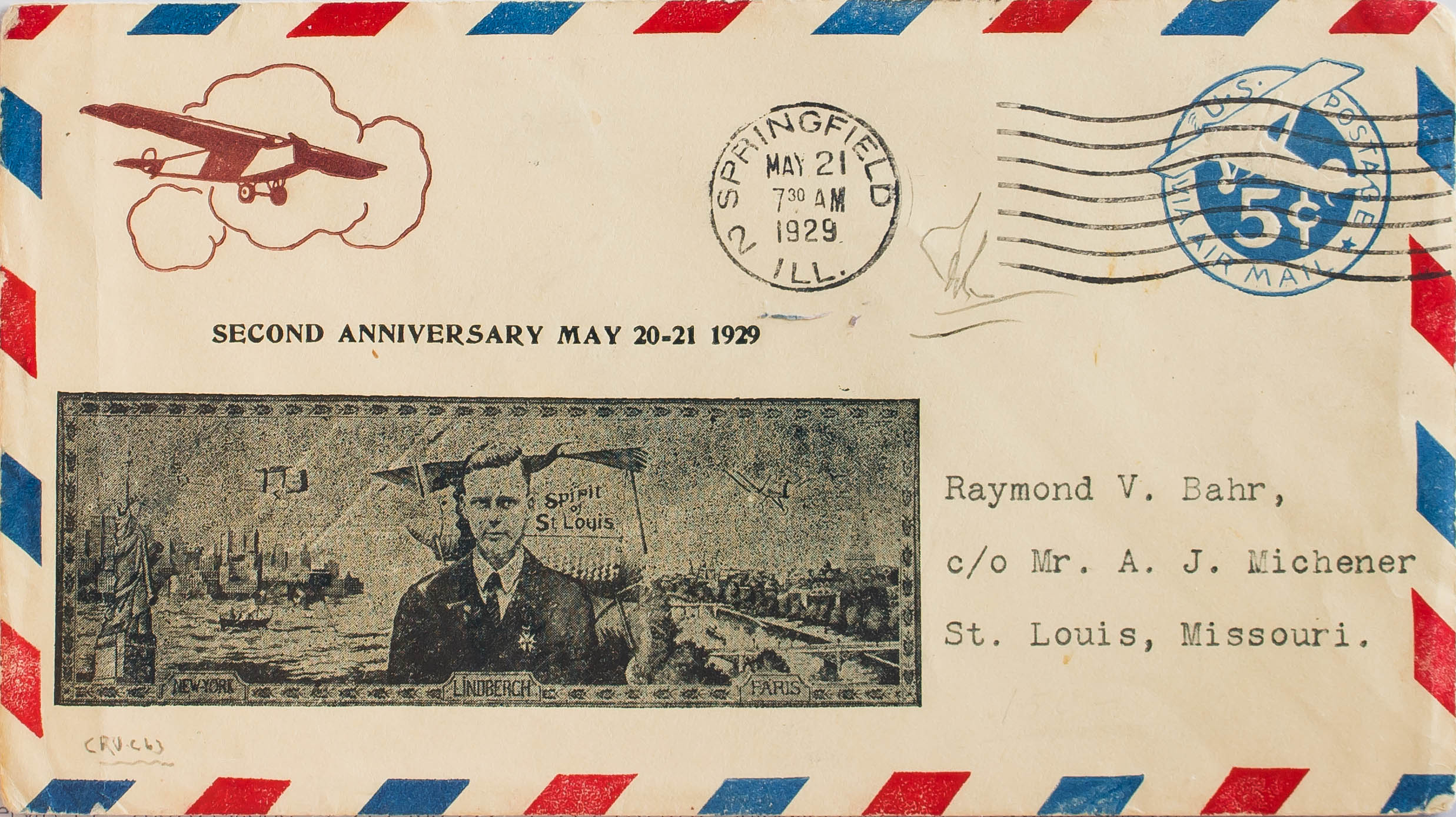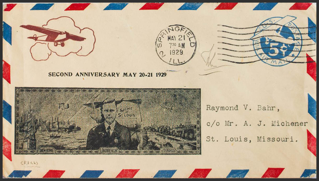1929. 5 ctvos azul sobre Entero Postal conmemorativo del 2º ANIVERSARIO DE LA TRAVESIA DEL ATLANTICO de SPRINGFIELD a SAINT LOUIS. MAGNIFICO Y RARO.