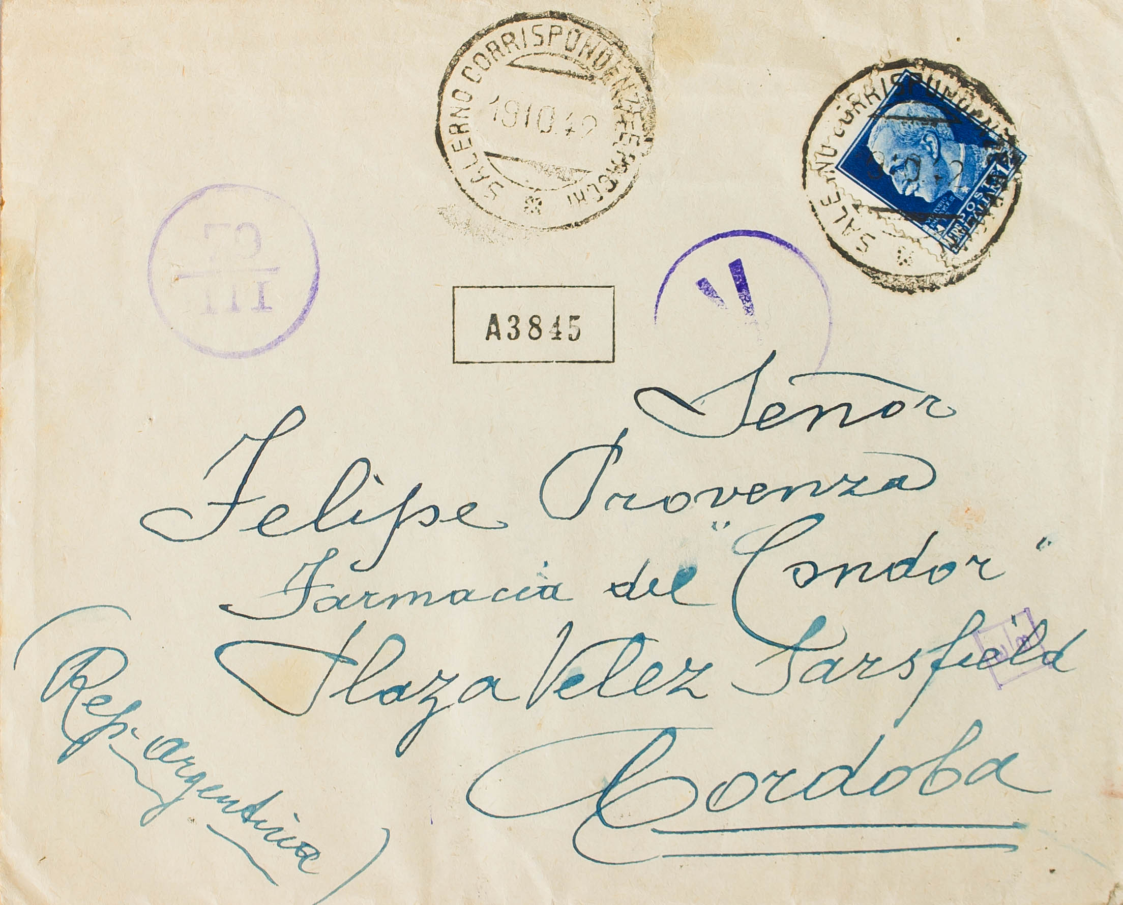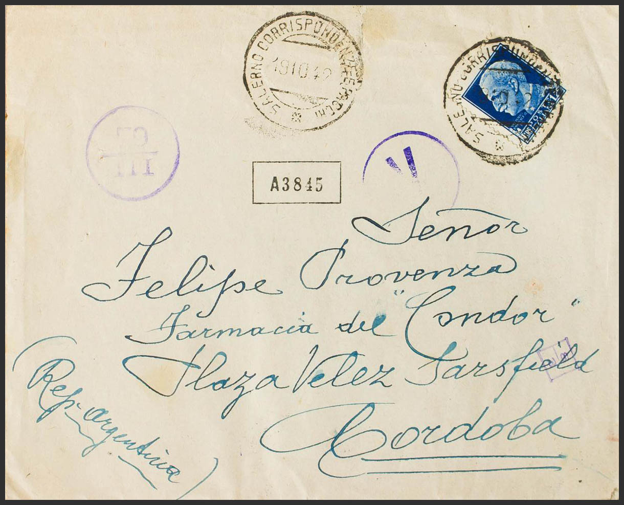 Yvert 234. 1942. 1´25 l azul. SALERNO a CORDOBA (ARGENTINA). Al dorso llegada. MAGNIFICA.