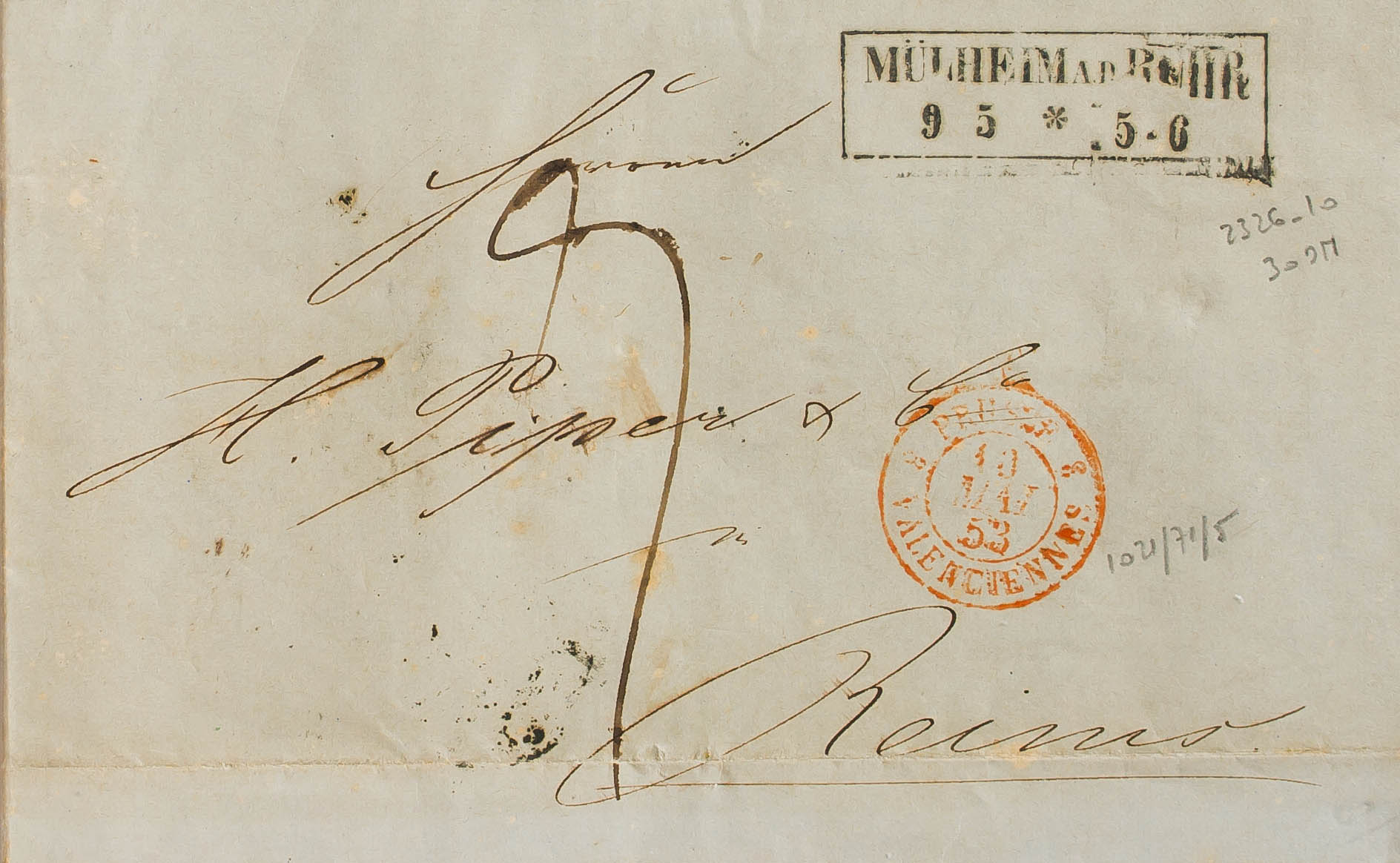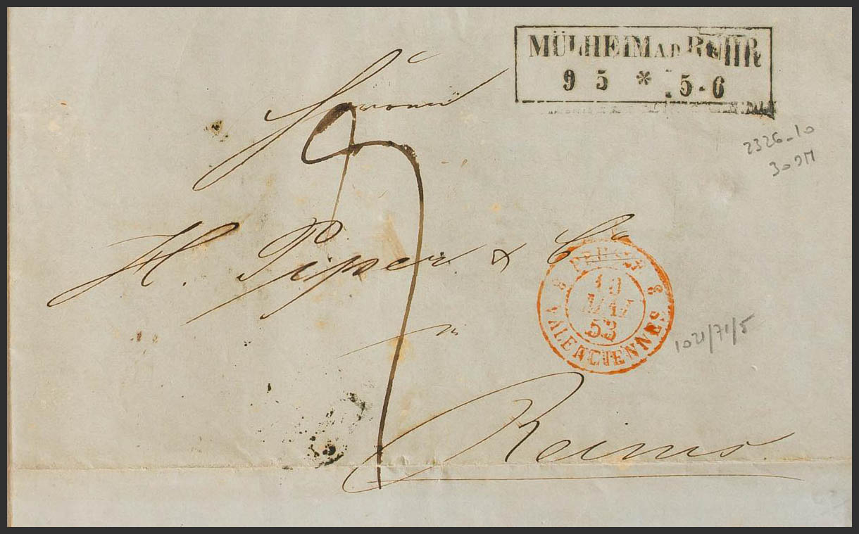 1853. MULHEIM a REIMS (FRANCIA). Marca MÜLHEIMAD.RUHR / 95*5-6, fechador de entrada PRUSSE / VALENCIENNES y porteo manuscrito. MAGNIFICA.