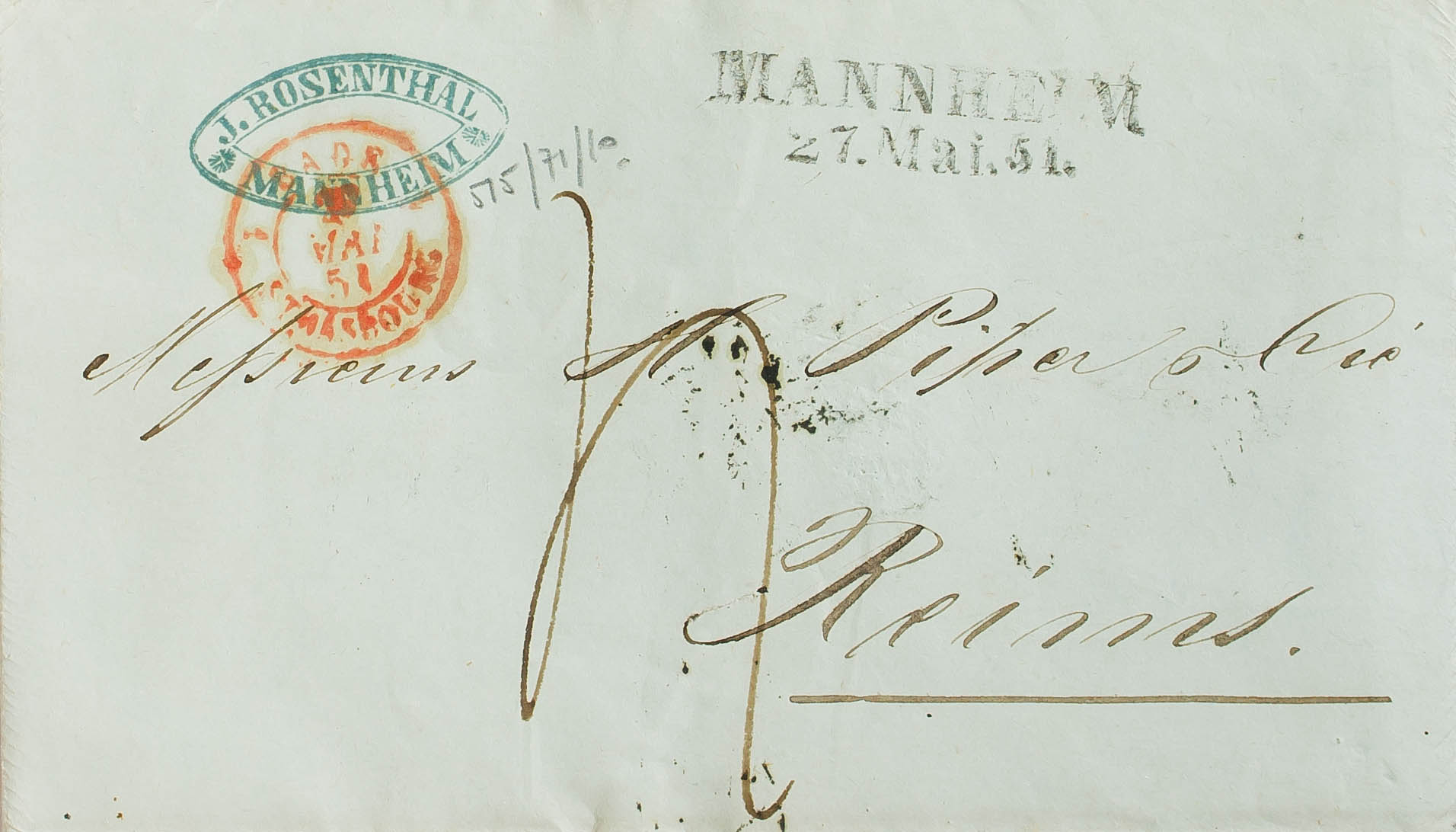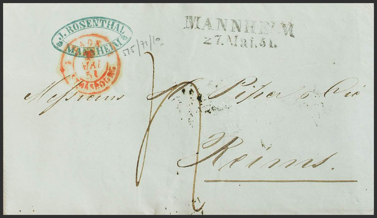 1851. MANHEIM a REIMS (FRANCIA). Marca MANNHEIM (sin encuadrar), fechador de entrada BADE / STRASBOURG y porteo manuscrito "4". MAGNIFICA.