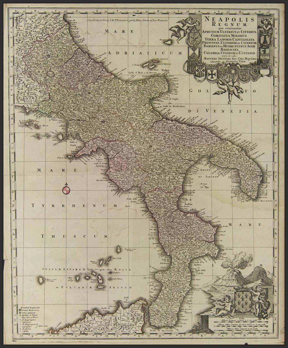1725. NEAPOLIS REGNUM QUO CONTINENTUR APRUTIUM ULTERIUS ET CITERIUS COMITATUS MOLISIUS TERRA LABORIS CAPITANIATA PRINCIPAT. George Matthaus Seutter. Ausburgo, 1725. MAGNIFICO Y MUY RARO, IDEAL PARA EL ESTUDIO DE LA HISTORIA POSTAL DE ESTA REGION.