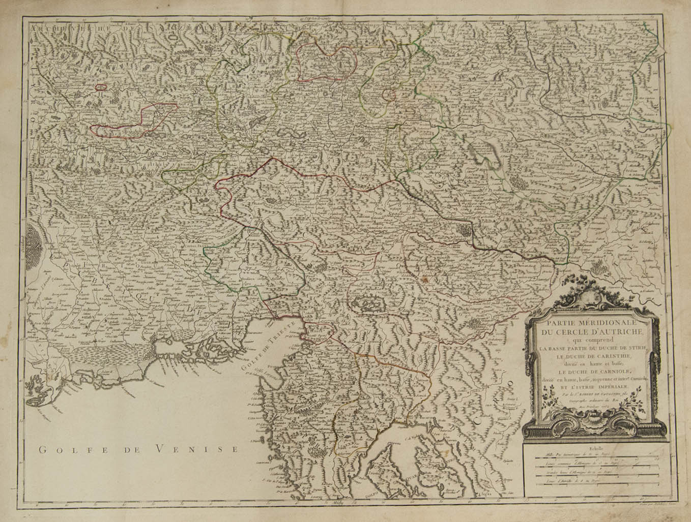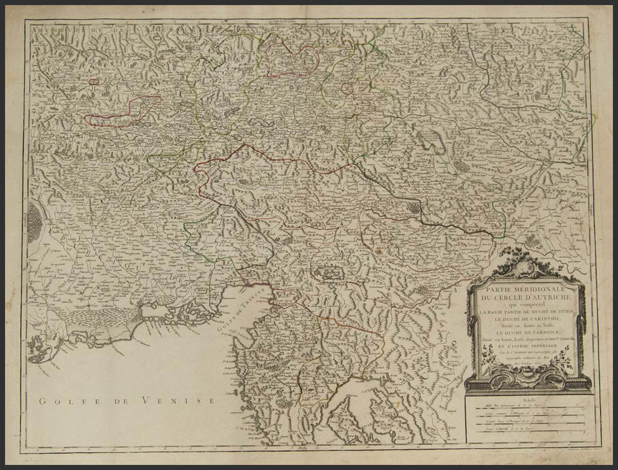 1752. PARTIE MERIDIONALE DU CERCLE D´AUTRICHE. Robert de Vaugondy. París, 1752 (correspondiente al Ducado de Stirie, Ducado de Carintia, Ducado de Carniole e Istria Imperial). MAGNIFICO E INUSUAL MAPA, IDEAL PARA EL ESTUDIO DE LA HISTORIA POSTAL DE ESTA REGION.