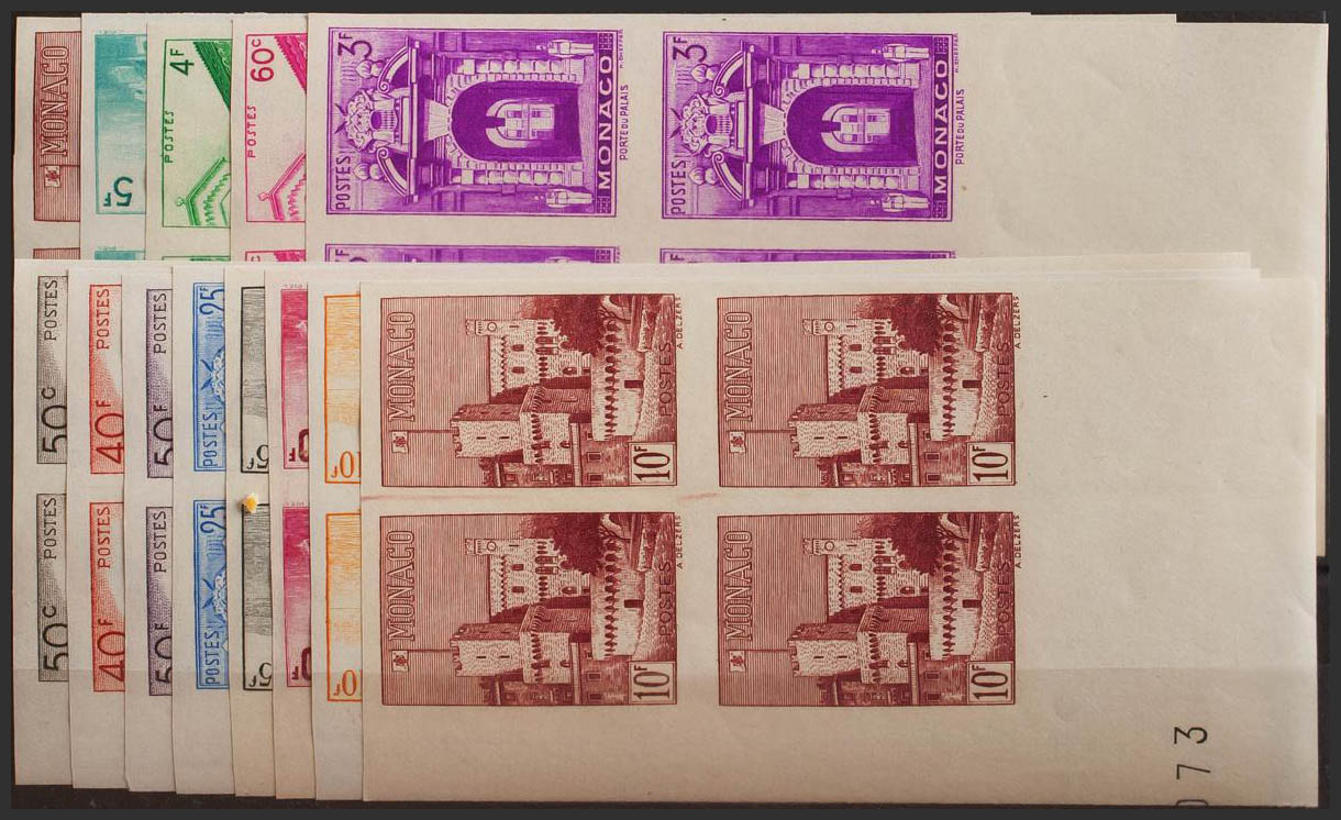 ★★Yvert 307/13C. 1948. Serie completa, bloque de cuatro, esquina de pliego. SIN DENTAR. MAGNIFICO. Yvert 2016: 810 Euros