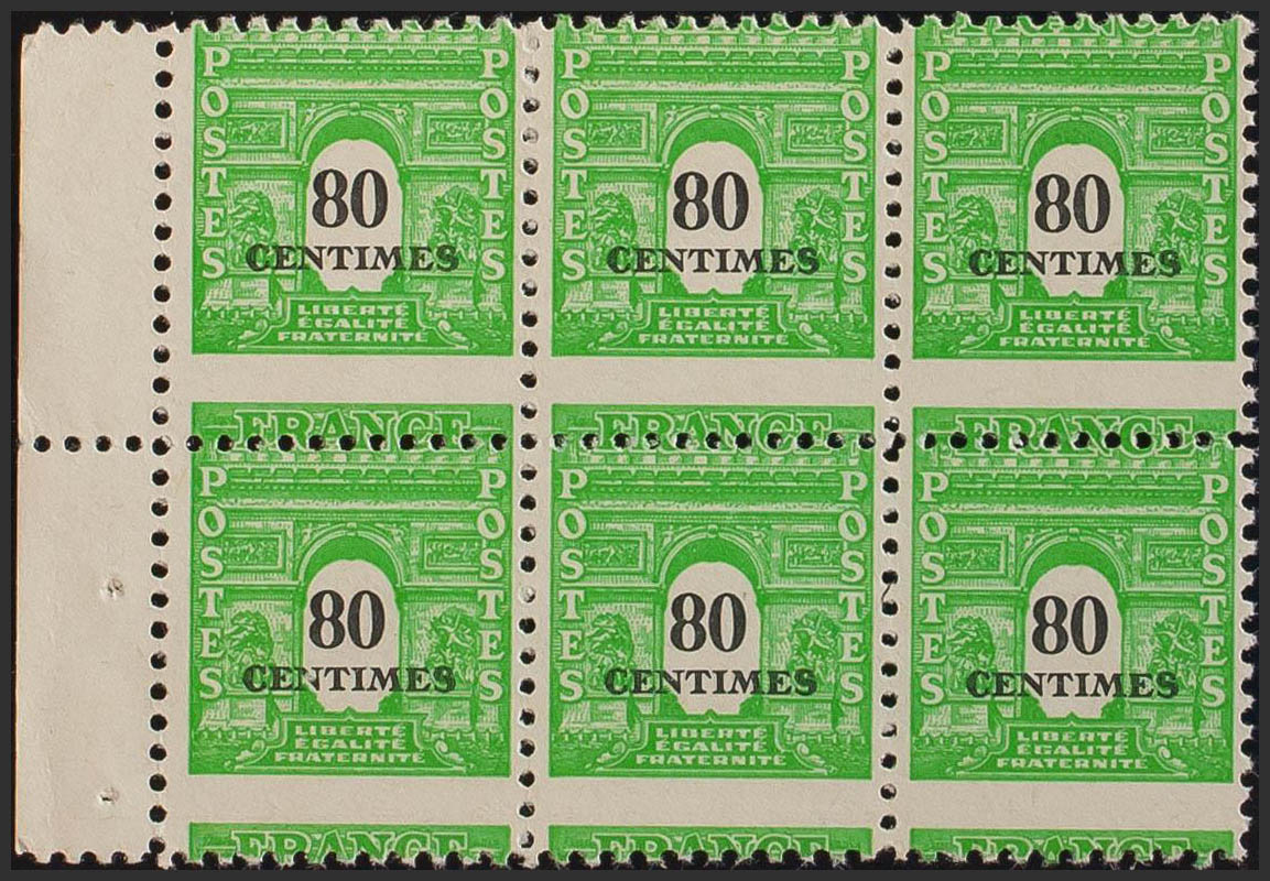 ★★Yvert 706(6). 1945. 80 cts verde, bloque de seis. DENTADO HORIZONTAL DESPLAZADO. MAGNIFICO. (Maury 2016: 706c, 300 Euros)