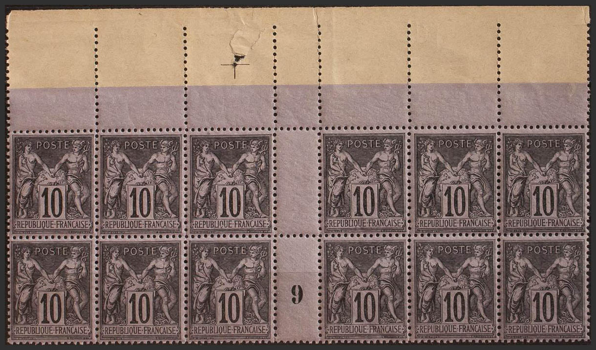 ★★Yvert 103(12). 1898. 10 cts negro sobre lila, bloque de doce con INTERPANEL (uno con cifra 9). Excelentes centrajes. MAGNIFICO Y RARO. Yvert 2014: +++540 Euros