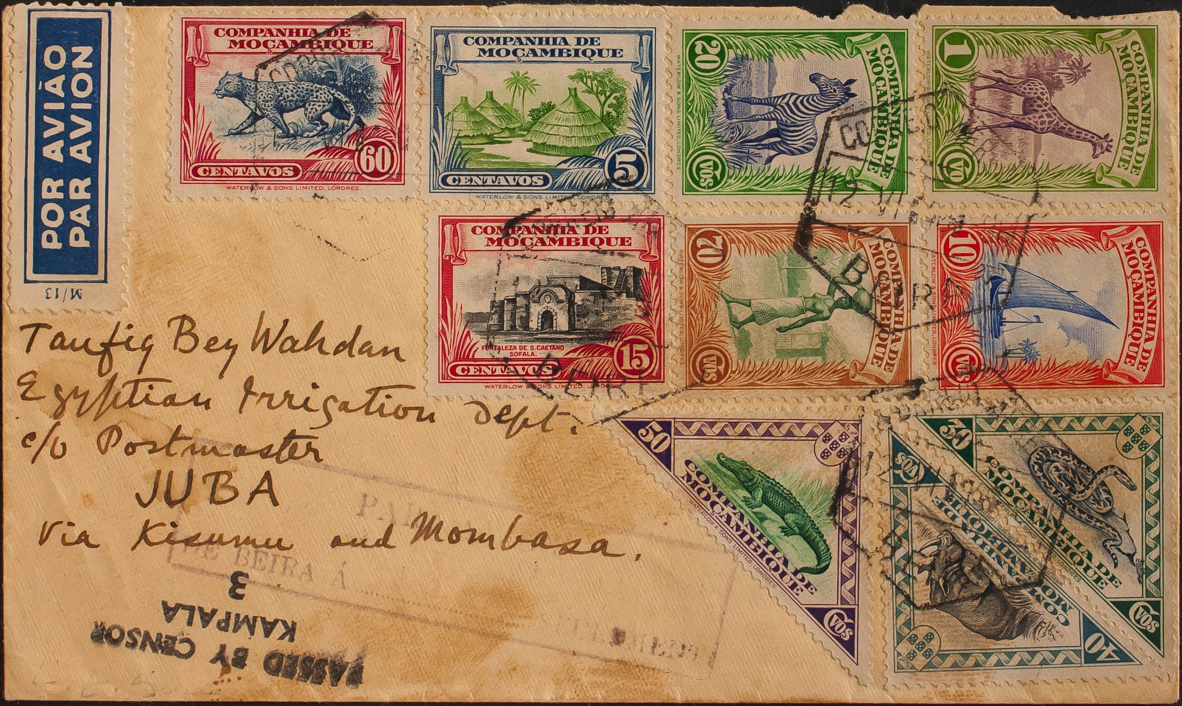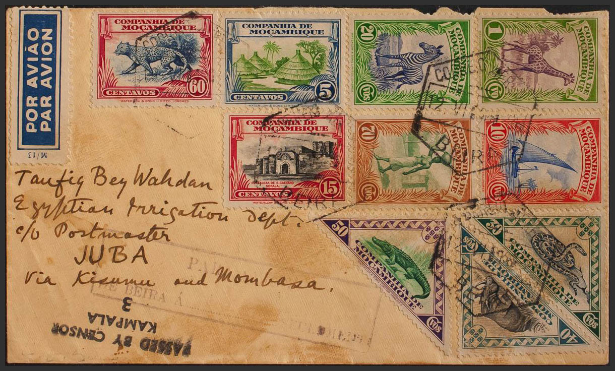 178/84, 186/88. 1938. Diversos valores. Correo Aéreo de BEIRA (MOZAMBIQUE) a JUBA (SUDAN). Al dorso llegada. MAGNIFICA Y MUY RARA Y ESPECTACULAR FRANQUEO.