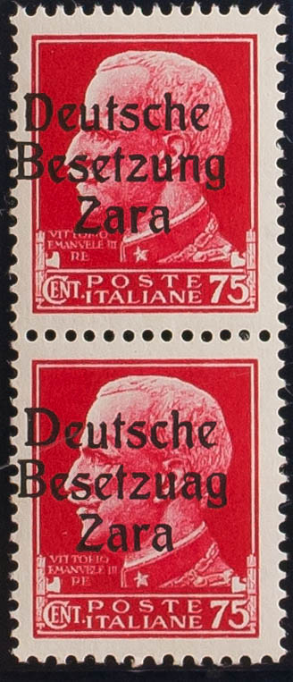 ★★Yvert 8(2). 1943. 75 cts rosa rojo, pareja. Un sello presenta la variedad BESETZUAG. MAGNIFICA Y RARA. (Sassone 8, 8a)
