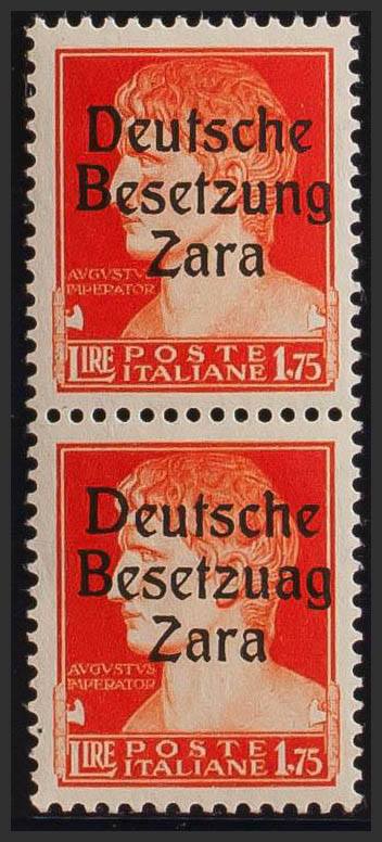 ★★Yvert 11(2). 1943. 1´75 liras naranja, pareja. Un sello presenta la variedad BESETZUAG. MAGNIFICA Y RARA. (Sassone 11, 11a)