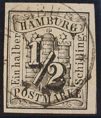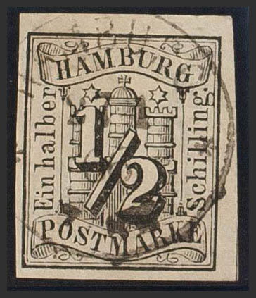 Yvert 1. 1859. ½ s negro. Matasello fechador HAMBURG. MAGNIFICO Y RARO. (Mi1 750 Euros)