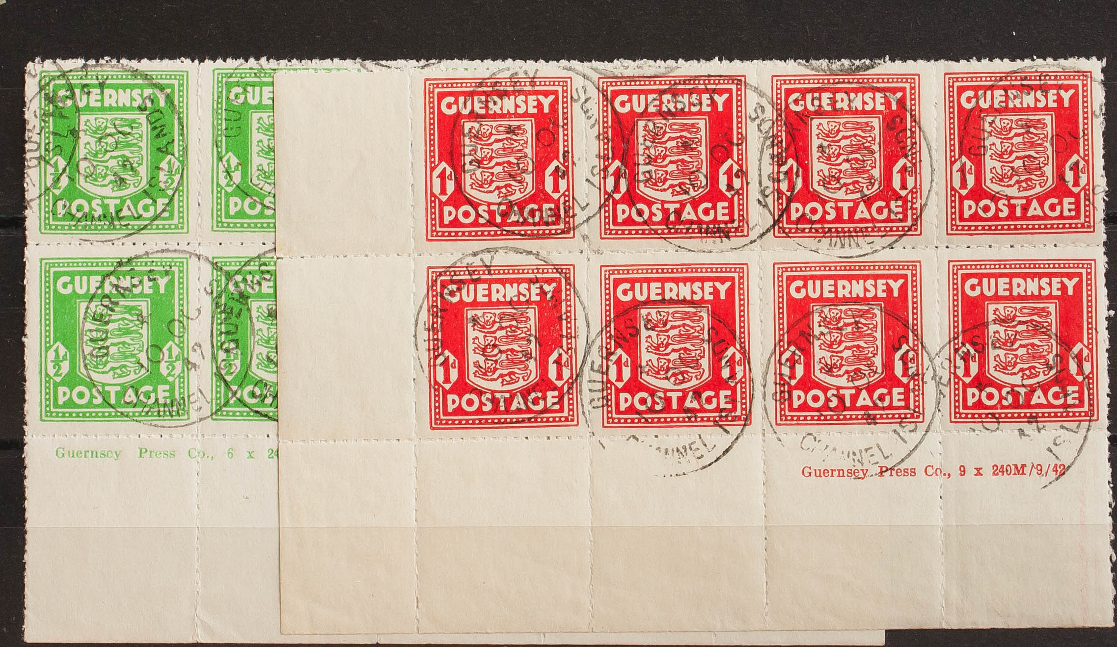 Yvert 1(8), 2(8). 1941. ½ p verde amarillo y 1 p rojo naranja, bloques de ocho, esquina de pliego con leyenda. MAGNIFICOS Y RAROS. (Mi1b, 2av)