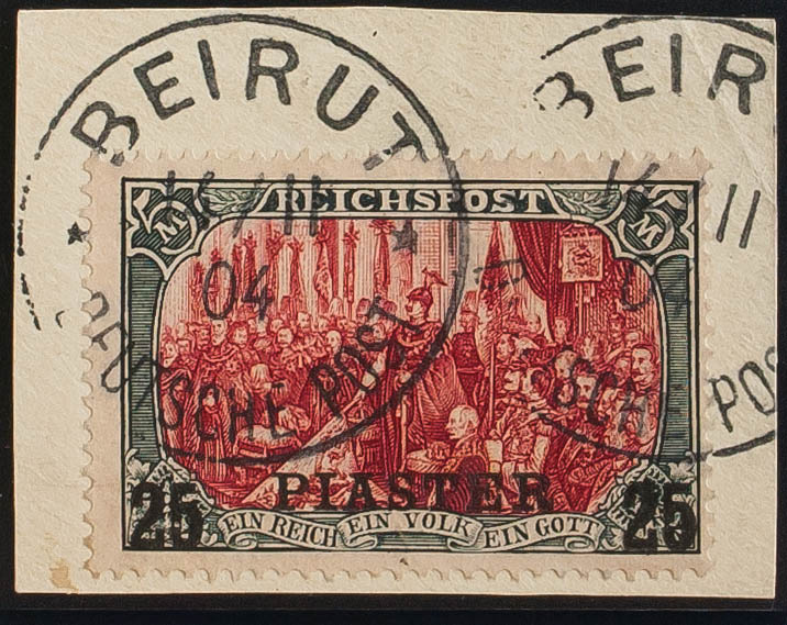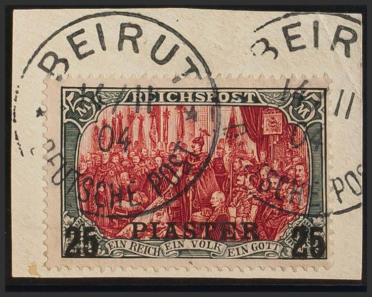 △Yvert 28. 1904. 25 pi sobre 5 m verde negro y carmÃn, sobre fragmento. Matasello BEIRUT / DEUTSCHE POST. MAGNIFICO Y RARO. (Mi23II 700 Euros)