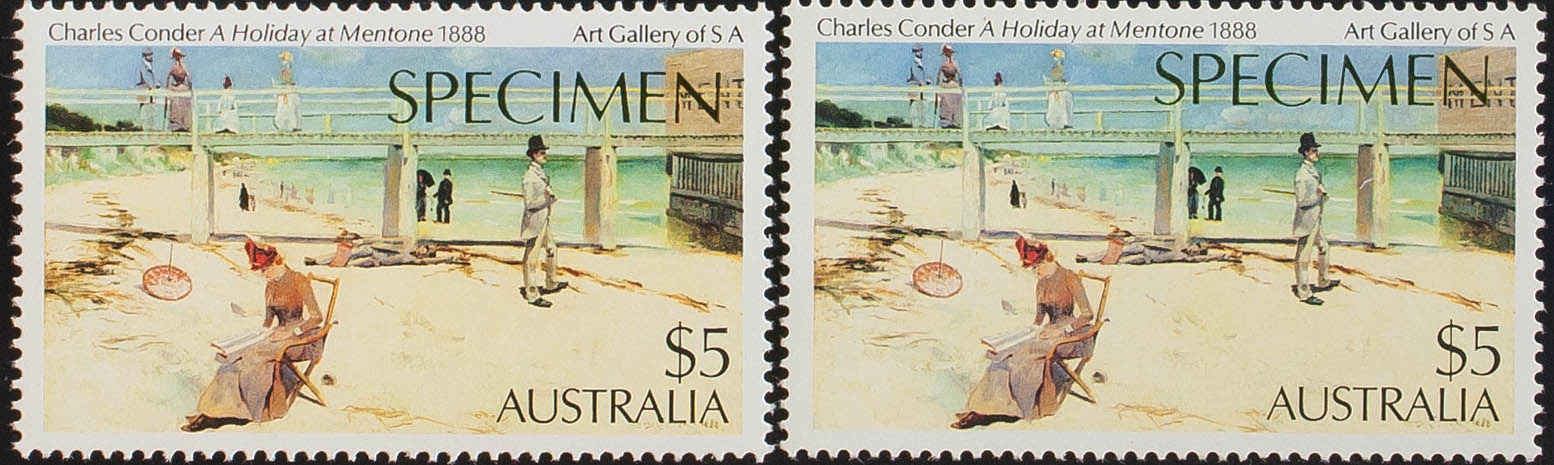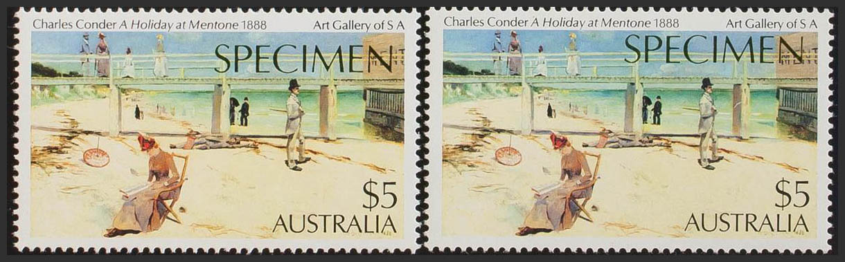 ★★Yvert 855, 855a. 1984. 5$ multicolor, dos sellos con diferentes tonalidades. Sobrecarga SPECIMEN. MAGNIFICOS.