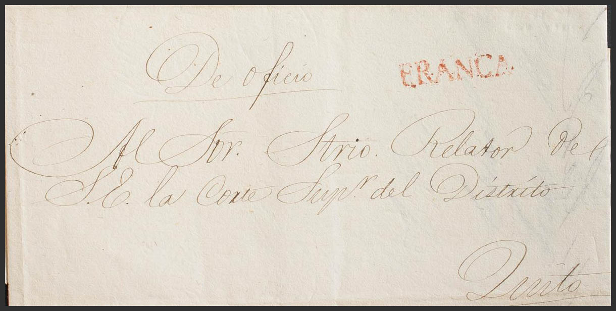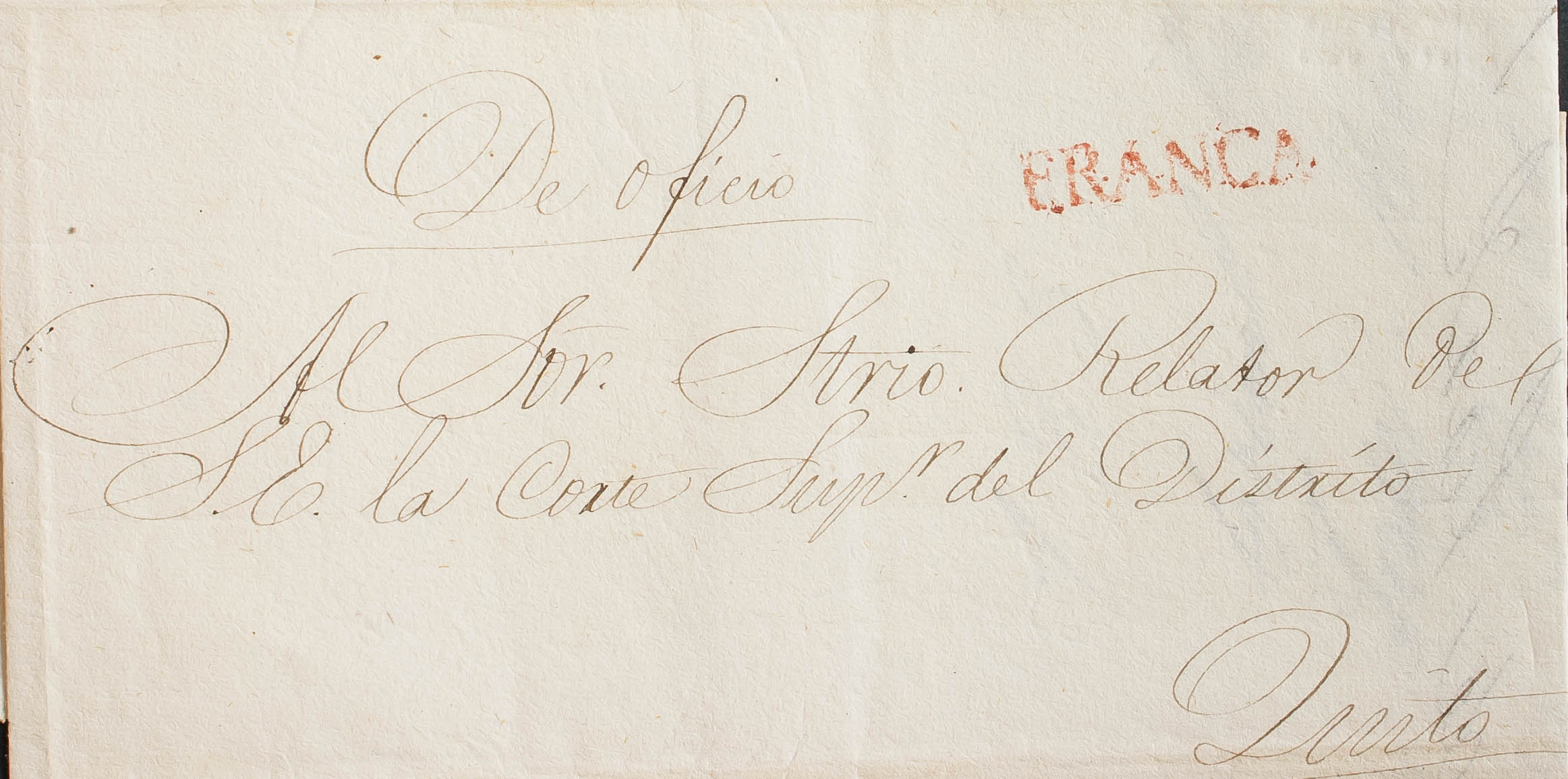 1855. Plica Judicial de AMBATO a QUITO. Marca FRANCA, en rojo. MAGNIFICA Y RARA.