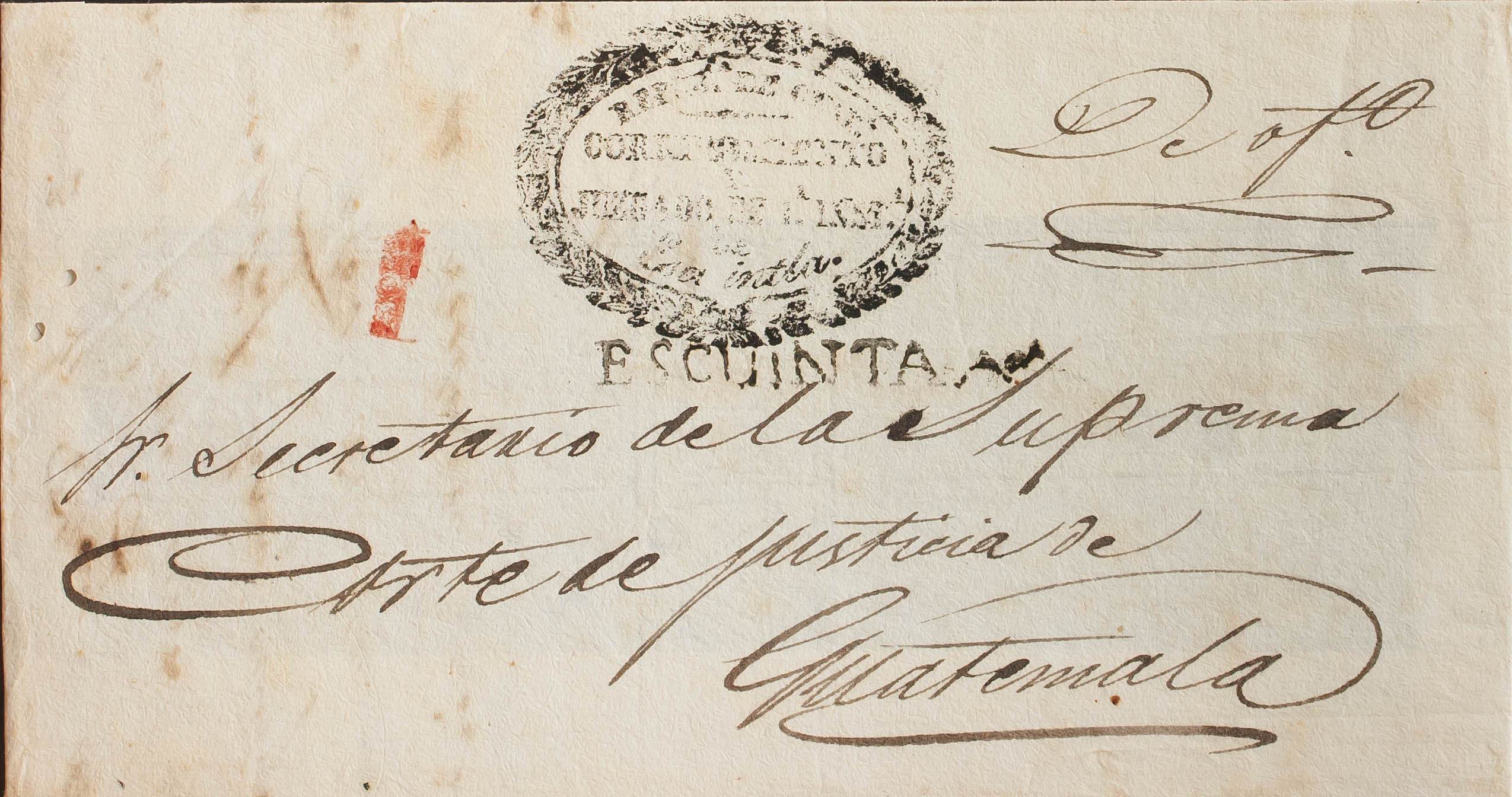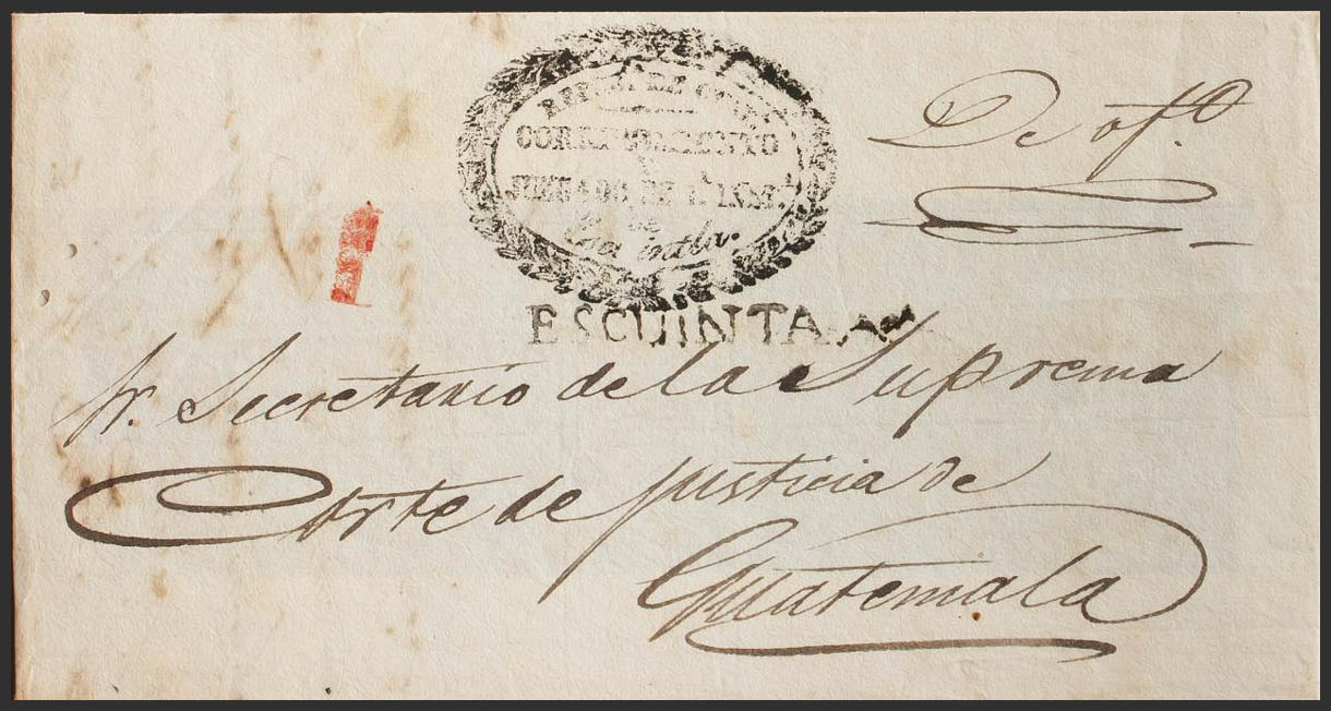 (1820ca). Frente de Plica Judicial de ESCUINTLA a GUATEMALA. Marca ESCUINTA, en tinta de escribir (igual a la utilizada durante el Periodo Colonial). MAGNIFICA.