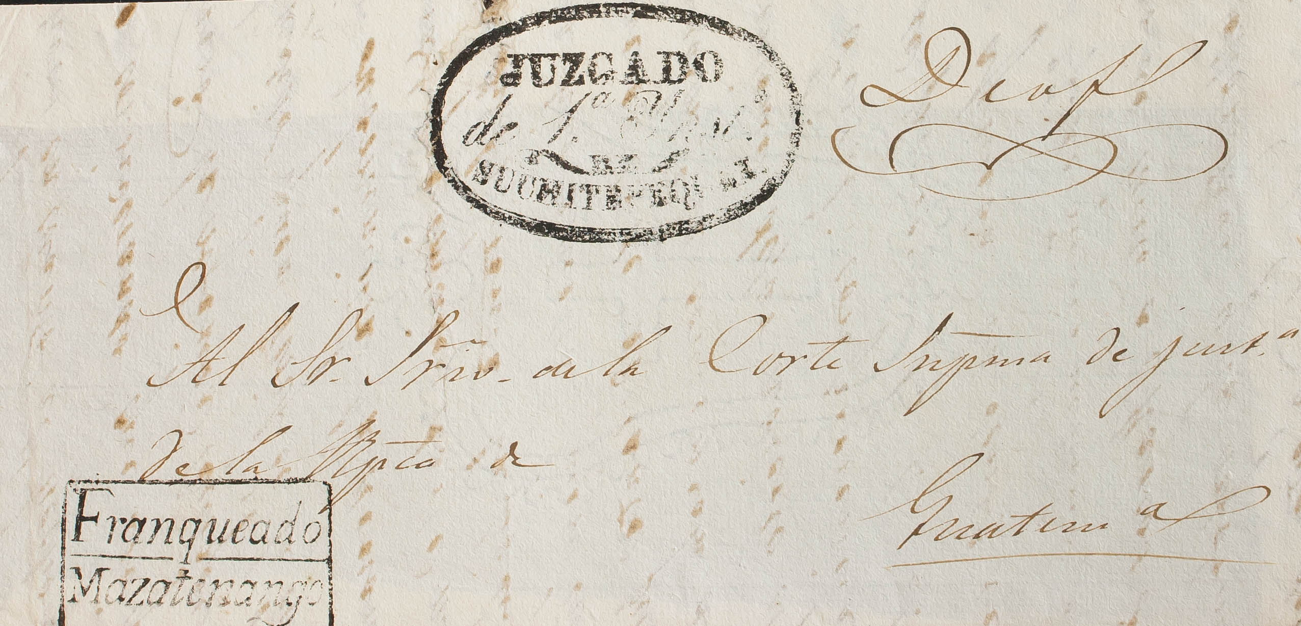 (1820ca). Frente de Plica Judicial de MAZATENANGO a GUATEMALA. Marcas JUZGADO / DE 1ª YNST / DE / SUCHITEPEQUEZ y FRANQUEADO / MAZATENANGO (P.E.5) edición 2004. MAGNIFICA Y RARISIMA.
