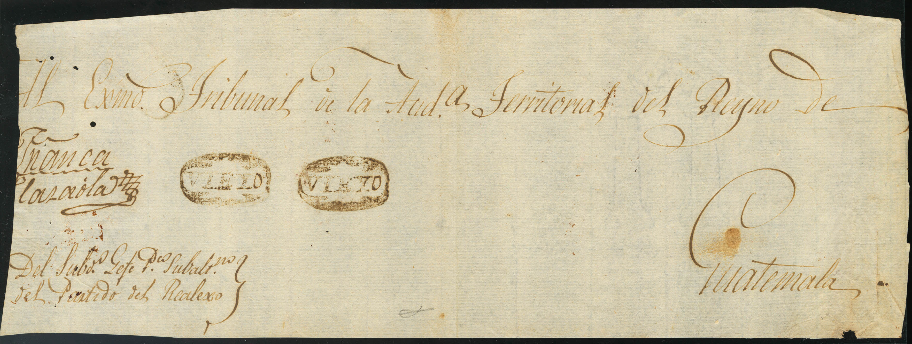 (1810ca). Frente de Plica Judicial de EL REALEJO a GUATEMALA. Marca V.LEXO (estampada dos veces), en tinta de escribir y manuscrito del Administrador de Correos "Franca Plazaola" (P.E.1 y P.E.2) edición 2004 (no se conocen cartas fechadas). MAGNIFICO Y UNICA PIEZA CONOCIDA CON LA REFERENCIA A CORREO LIBRE DE PORTE, REFERENCIADA EN LA OBRA DE TIZON.