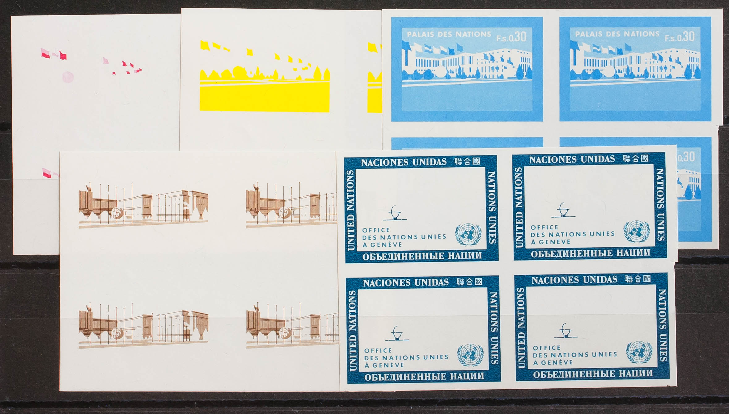 ★★Yvert 4. 1969. 30 cts multicolor, bloque de cuatro. CINCO FASES DE COLOR (sin dentar). MAGNIFICOS.