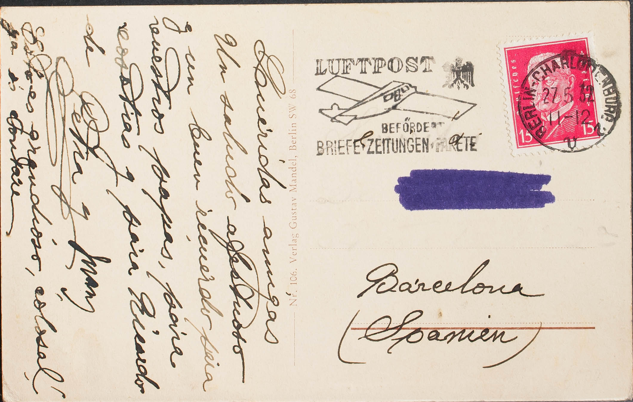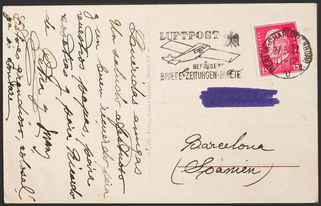 Yvert 405. 1932. 15 p rojo carmín. Tarjeta Postal de BERLIN a BARCELONA. En el frente marca LUFTPOST / BEFORDERT / BRIEFE ZEMUNGEN PAKETE. MAGNIFICA.
