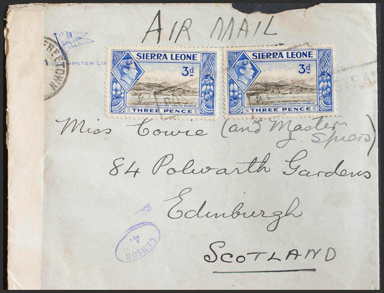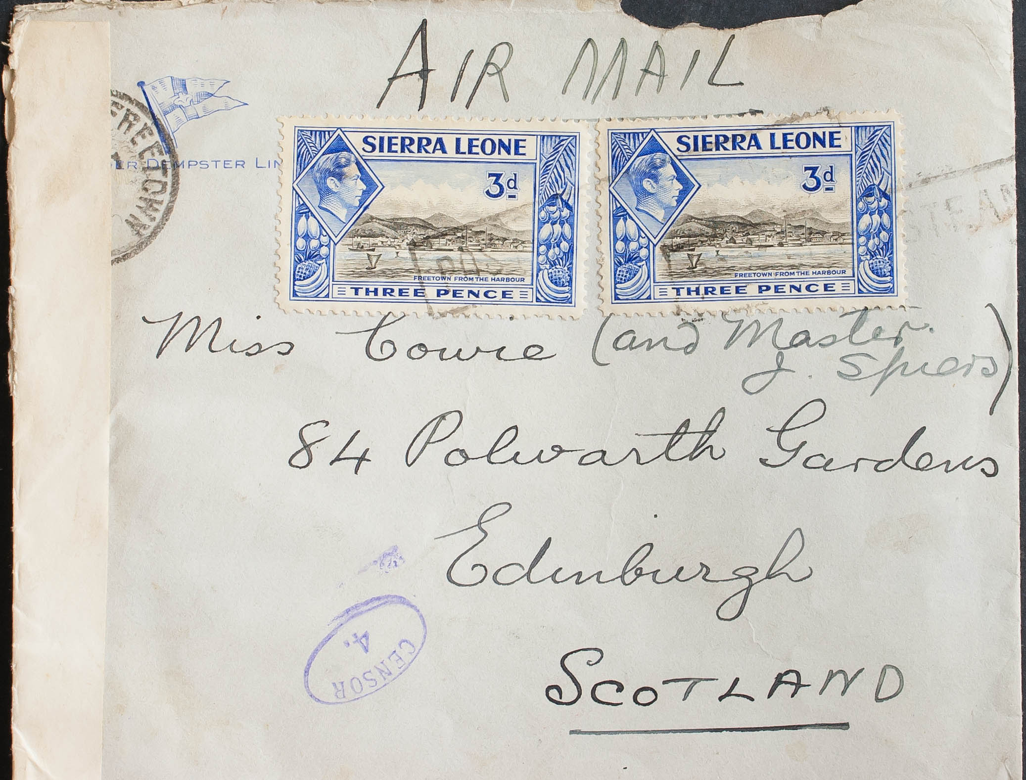 Yvert 162(5). 1938. 3 p ultramar y negro, cinco sellos (tres al dorso). FREETOWN a EDIMBURGO (ESCOCIA). Matasello POSTED ON STEAMER. MAGNIFICA.