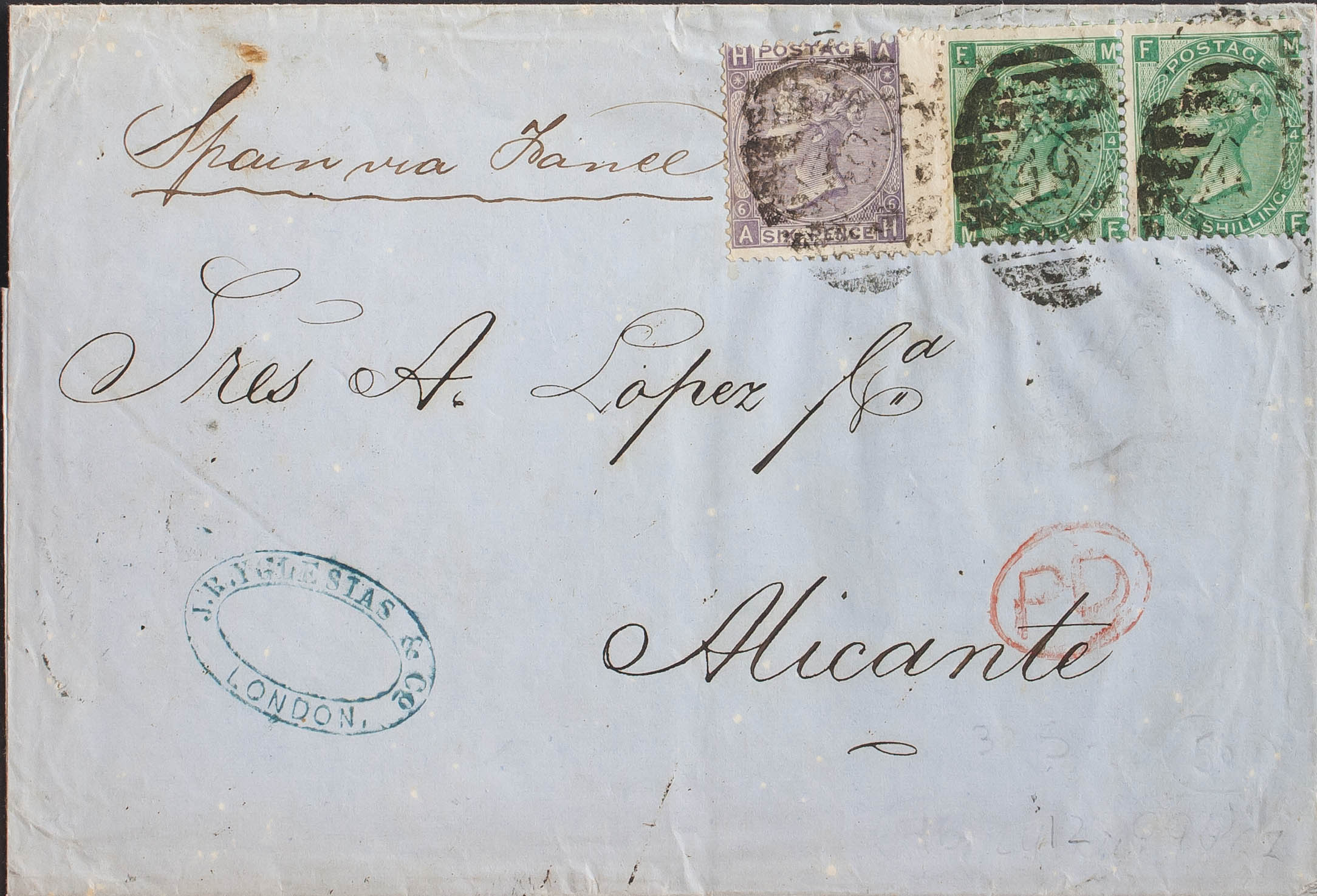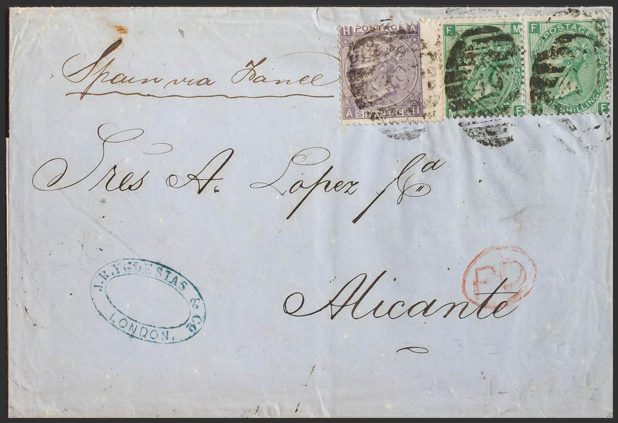 Yvert 29, 31(2). 1865. 6 p violeta Plancha 6 y 1 s verde Plancha 4. LONDRES a ALICANTE. MAGNIFICA E INUSUAL DESTINO. (SG97, 101)