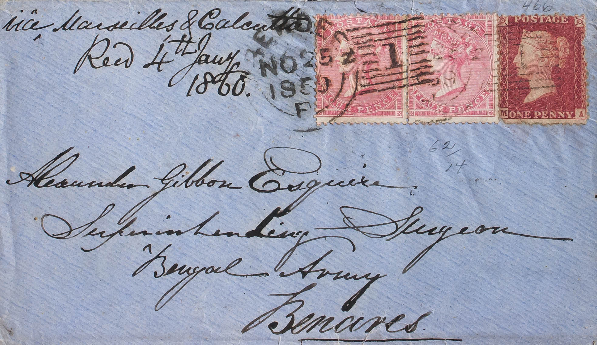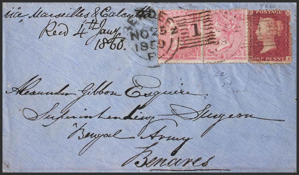 Yvert 14, 18(2). 1859. 1 p rojo carmín (defectitos) y 4 p rosa, dos sellos. ABERDEEN a BENARES (INDIA), circulada vía Marsella y Calcuta (dirigida a un médico del Ejército Bengalí). BONITA.