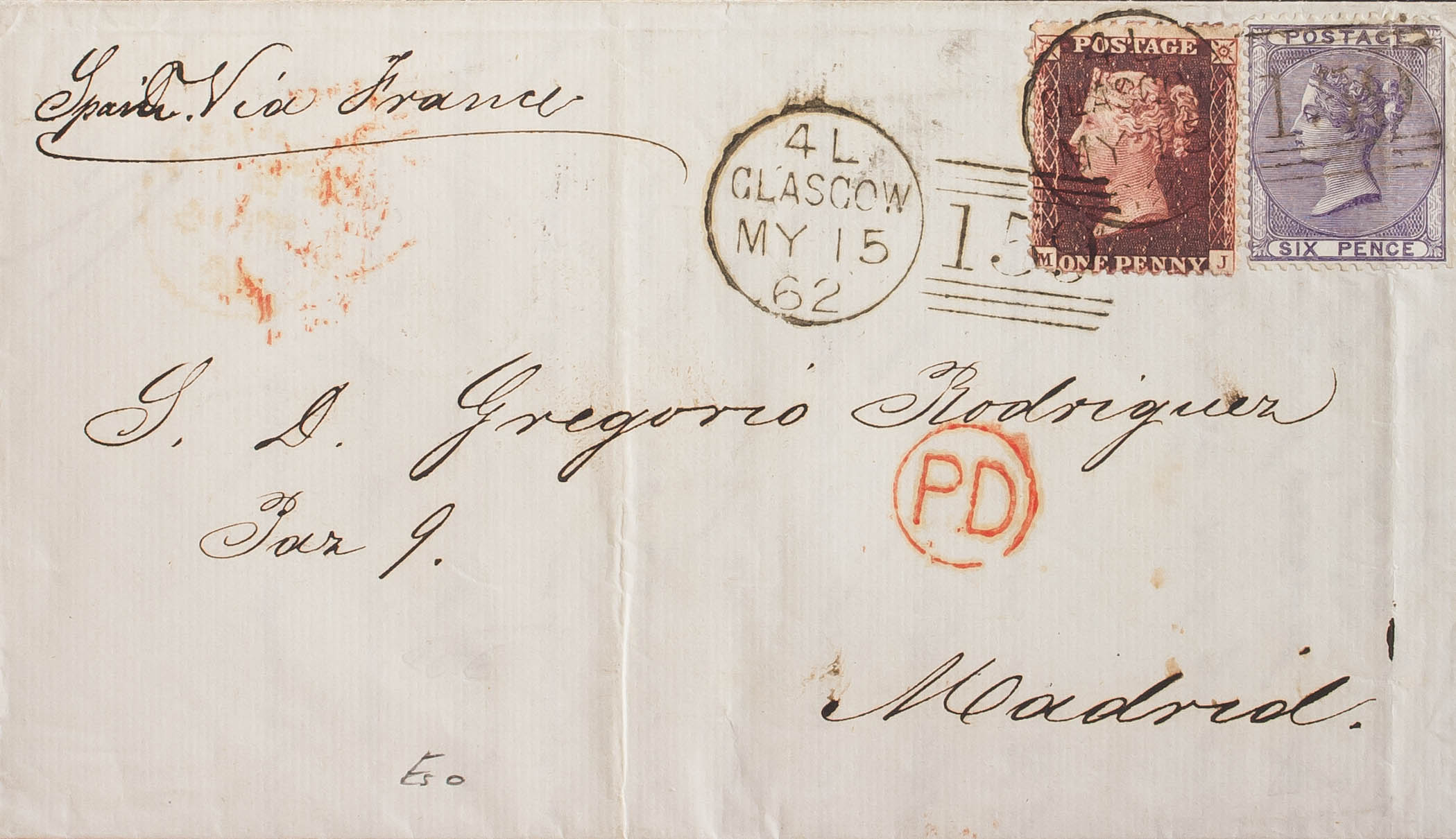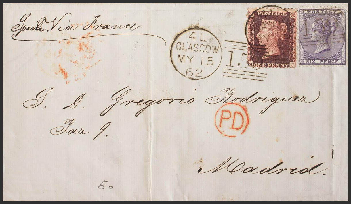 Yvert 14, 19. 1862. 1 p rojo carmÃn y 9 p violeta intenso (doblez de archivo). GLASGOW a MADRID. Matasello dúplex GLASGOW / 159. MAGNIFICA. (SG40, 69)