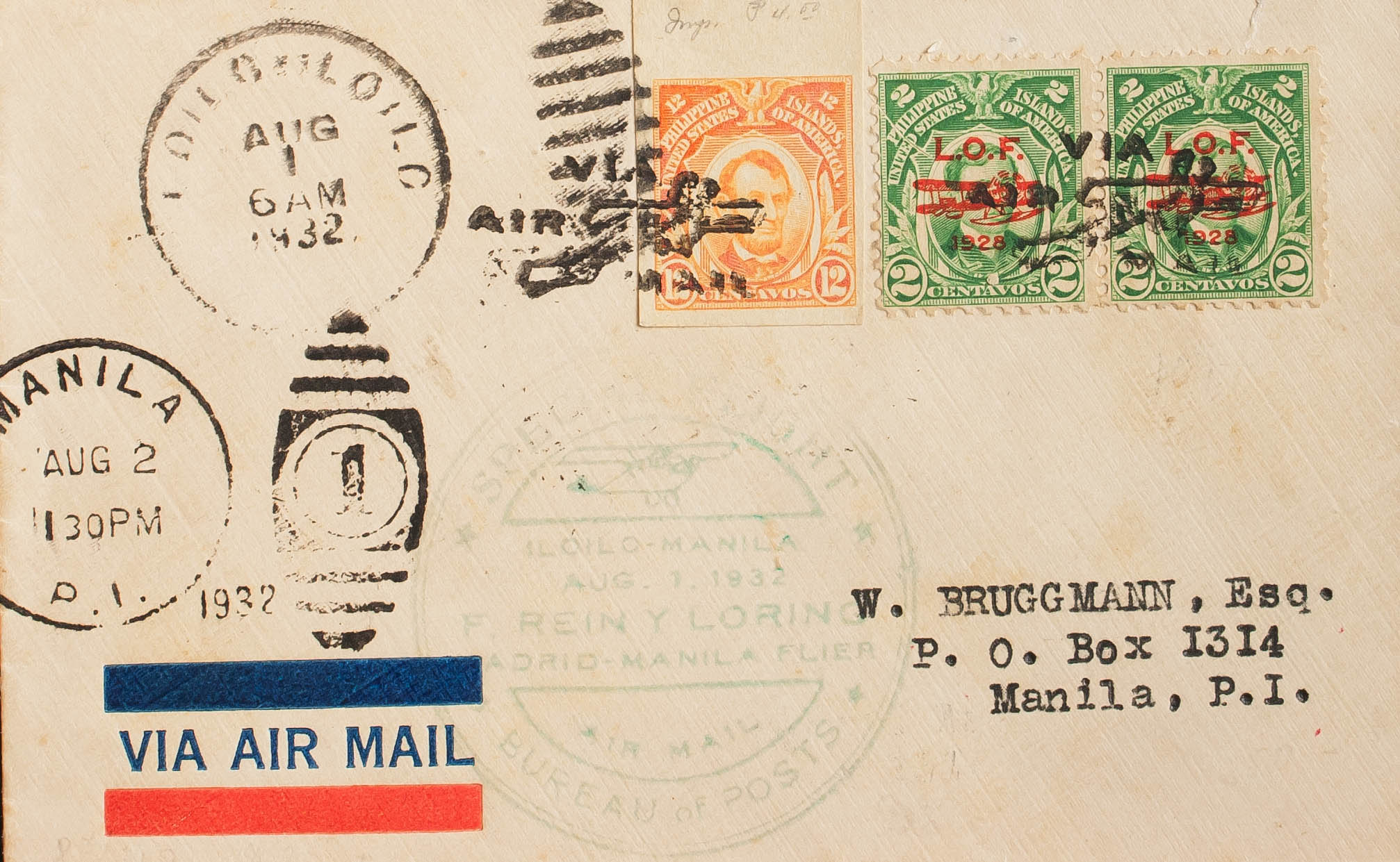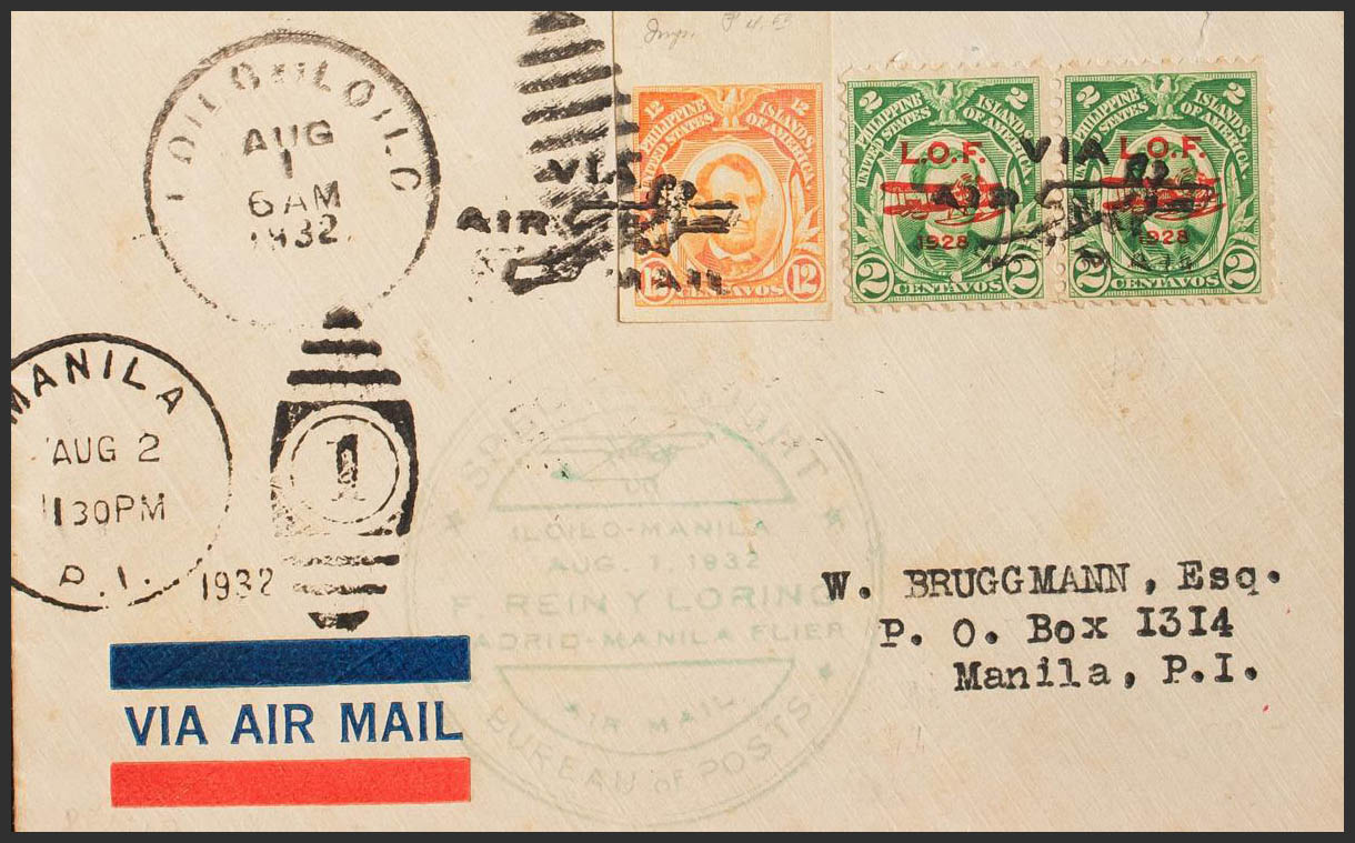 Yvert 210, Aéreo 15(2). 1932. 12 ctvos naranja SIN DENTAR y 2 ctvos verde, dos sellos aéreos. ILO-ILO a MANILA. Matasello VIA / AIR MAIL y en el frente marca SPECIAL FLIGHT / ILOILO-MANILA / AUG.1.1932 / F. REIN Y LORING / MADRID-MANILA FLIER / BUREAU OF POSTES, en azul y al dorso llegada. MAGNIFICA Y RARA.