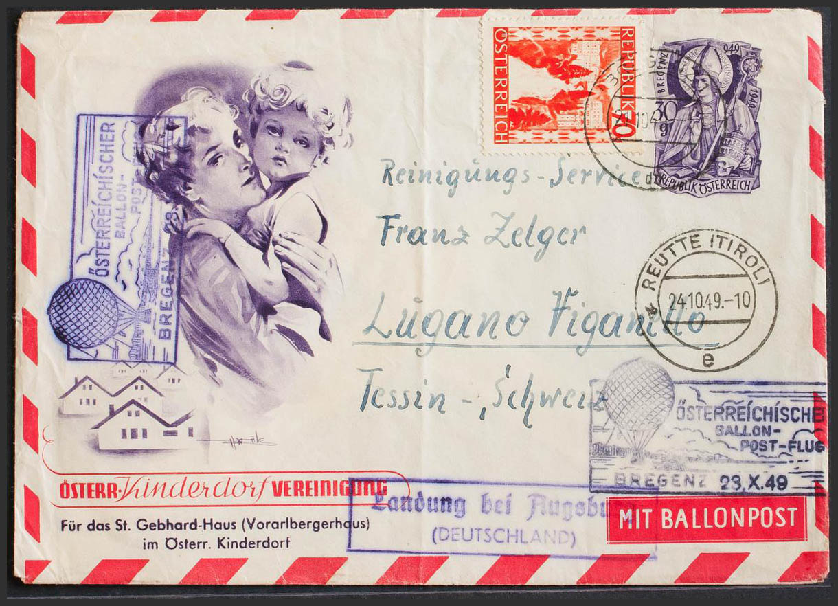 Yvert 706. 1949. 30 g violeta sobre Entero Postal de REUTTE a LUGANO (SUIZA), con franqueo complementario de 70 g naranja. En el frente marca OSTERREICHISCHER / BALLON / POST-FLUG / BREGENZ, en violeta. MAGNIFICA.