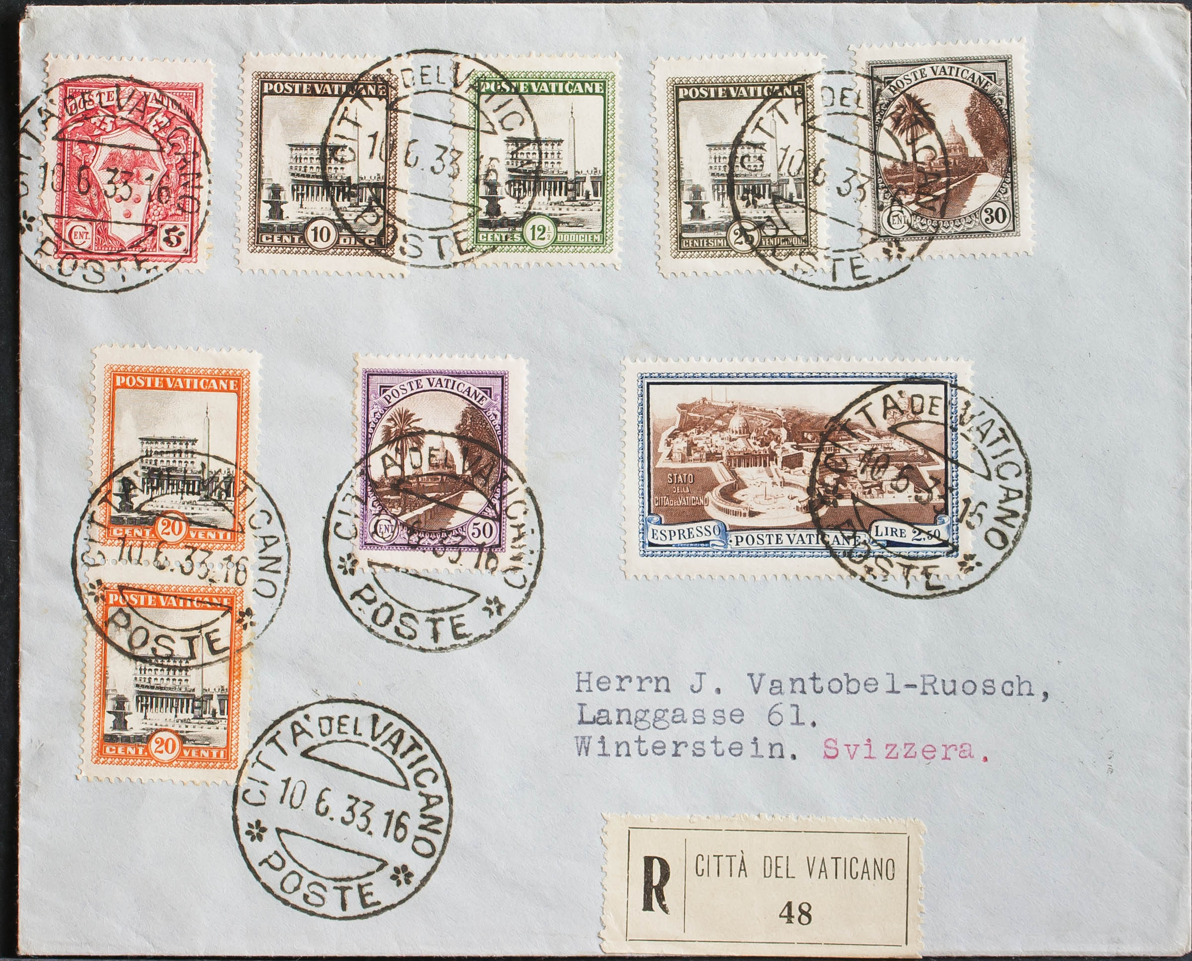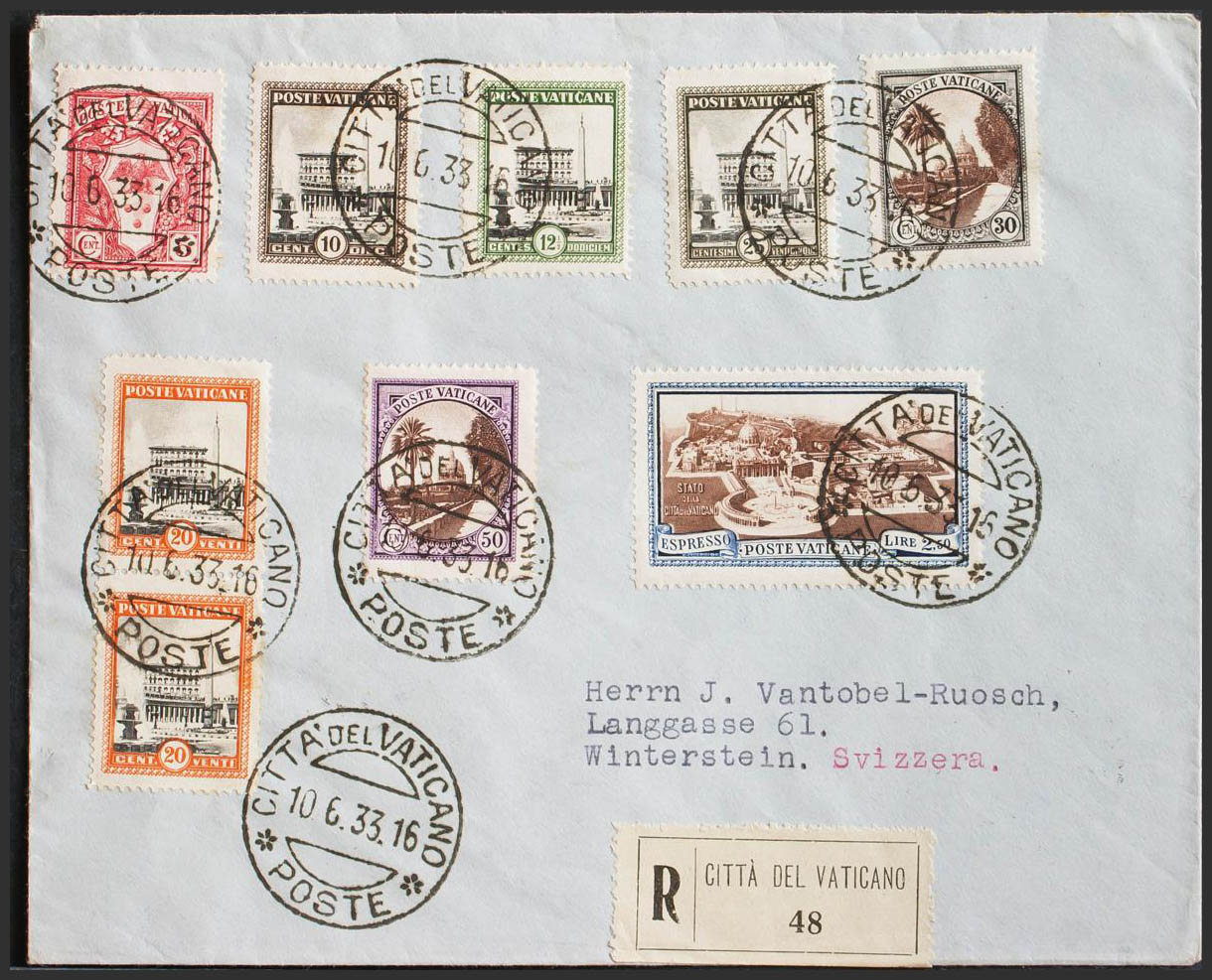 Yvert 44/50, Urgente 4. 1933. Diversos valores. Certificado de CIUDAD DEL VATICANO a WINTERSTEIN (SUIZA). Al dorso tránsitos. MAGNIFICA.