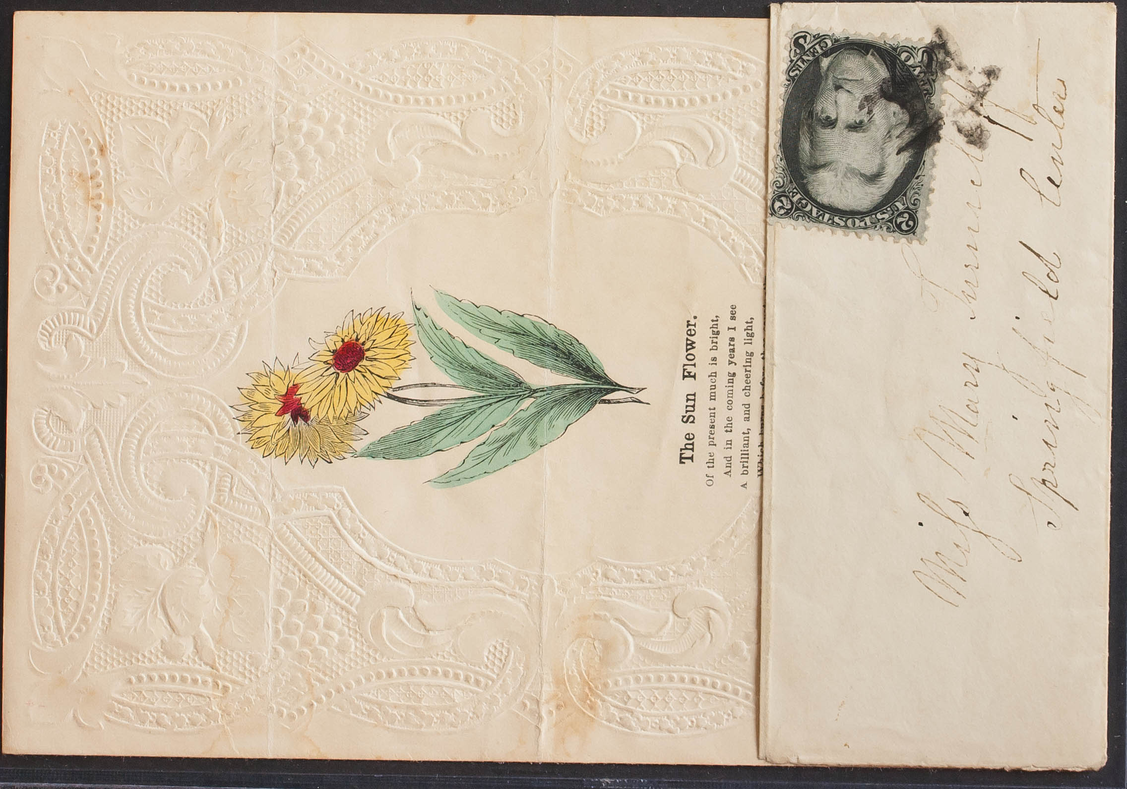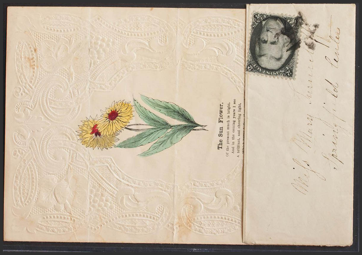 Yvert 27. (1863ca). 2 ctvos negro. Dirigida a SPRINGFIELD. Matasello fancy "Estrella", en el interior tarjeta tipo "Valentine" (doblada). MAGNIFICA E INUSUAL. (Scott 73)