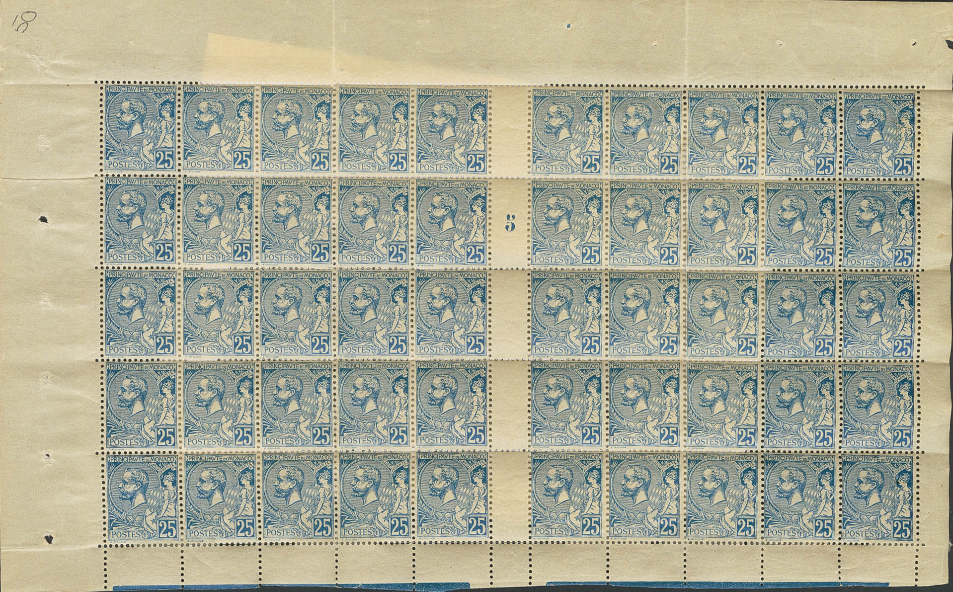 ★★Yvert 25(50). 1901. 25 cts azul, bloque de cincuenta con interpanel central. MAGNIFICO Y RARO. Yvert 2016: 2.000 Euros