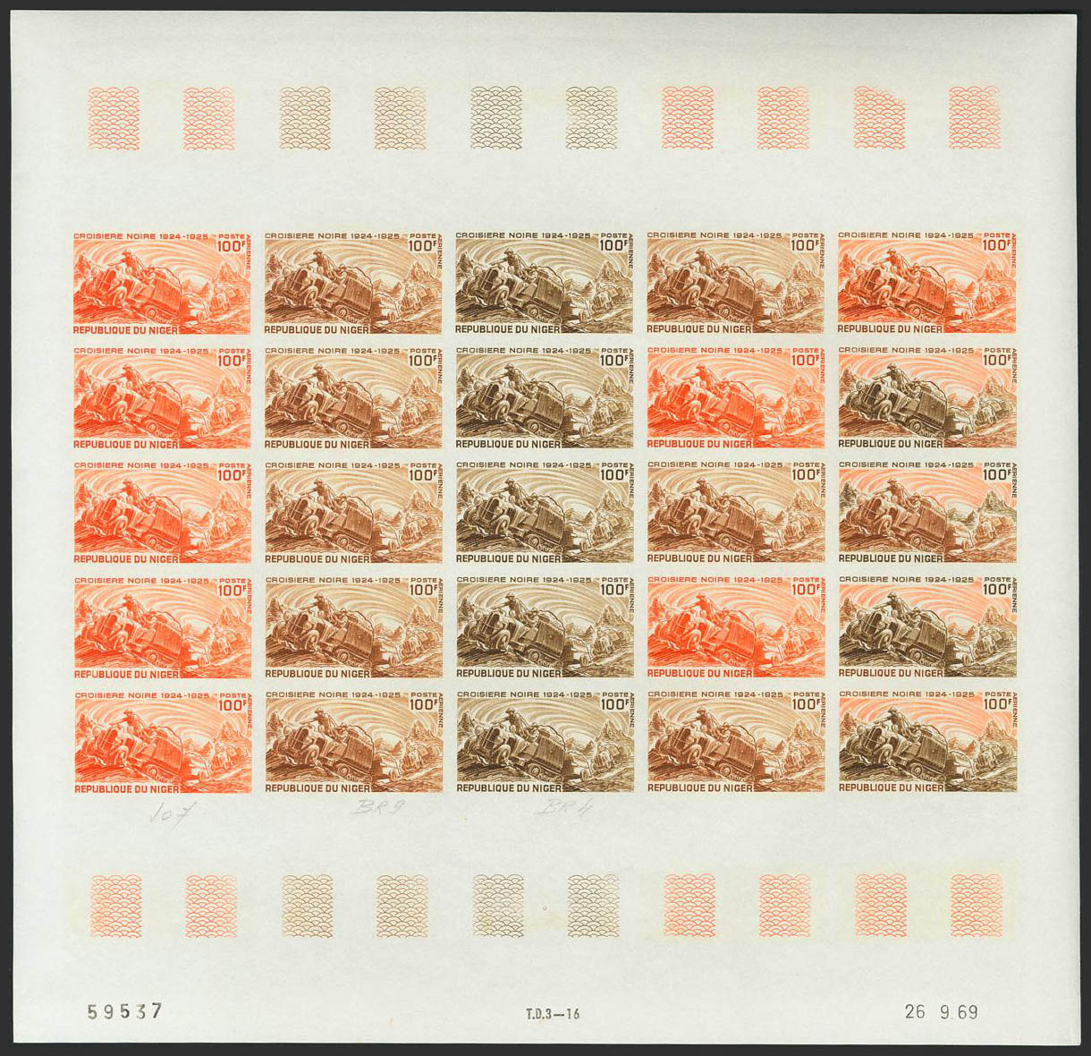 ★★Yvert 116(25). 1969. 100 f multicolor, hoja completa de veinticinco sellos. ENSAYOS DE COLOR y SIN DENTAR, en diferentes colores e incluyendo los multicolores de la última fila. MAGNIFICA Y RARA.